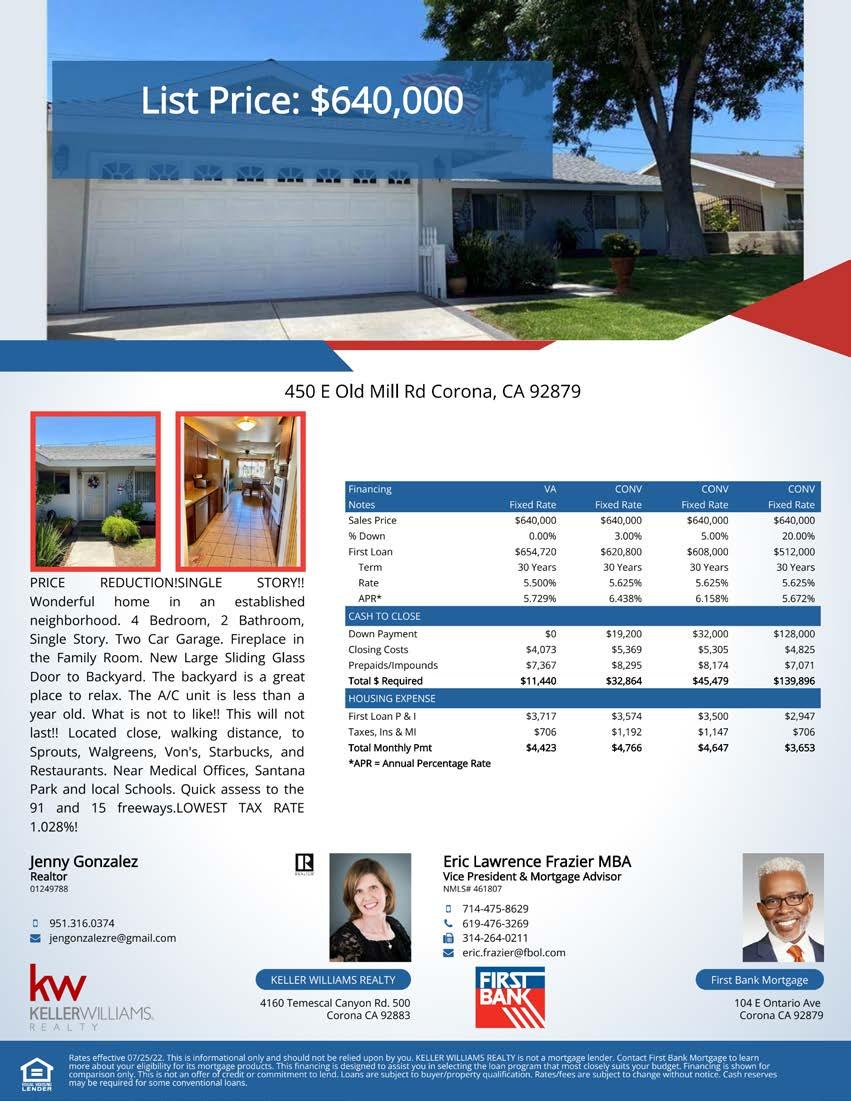 LISTED FOR $640,000 450 E Old Mill Rd Corona, CA 92879 Property Information PRICE REDUCTION!SINGLE STORY!! Wonderful home in an established neigh borhood. 4 Bedroom, 2 Bathroom, Single Story. Two Car Garage. Fireplace in the Family Room. New Large Sliding Glass Door to Backyard. The backyard is a great place to relax. The A/C unit is less than a year old. What is not to like!! This will not last!! Located close, walking distance, to Sprouts, Walgreens, Von’s, Star bucks, and Restaurants. Near Medical Offices, Santana Park and local Schools. Quick assess to the 91 and 15 freeways.LOWEST TAX RATE 1.028%! Call Jenny Gonzalez Realtor DRE#01249788 mobile: (951) 316-0374 e-mail: jengonzalezre@gmail.com Click Here to Watch Listing Interview