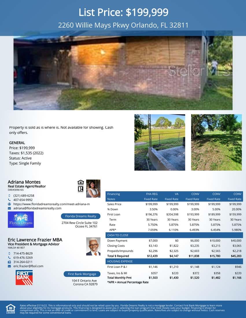 ADRIANA MONTES, JD MBA m: (321) 689-6258 adriana@floridadreamsrealty.com www.floridadreamsrealty.com LIST PRICE: $199,999 2260 WILLIE MAYS PKWY ORLANDO, FL 32811 GENERAL Price: $200,000 Taxes: $1,535 (2022) Status: Active Type: Single Family MLS ID: O6039035 Updated: 6/30/2022 Added: 2 day(s) ago ROOMS bathrooms Total Bathrooms: 2 Full Bathrooms: 2 bedrooms Total Bedrooms: 3 LOT FEATURES Lot Size (Acres): 0.16 Lot Size (Sq. Ft.): 6,785 Street/Road Desc.: Other Lot Features: Near Public Transit Rcmdd Zoning: R-1