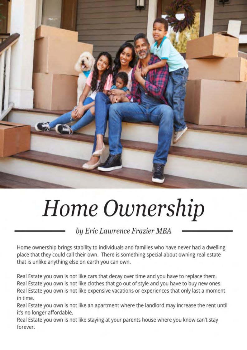 Eric L. Frazier and is headquartered in Riverside, California. We are advocates for homeownership, wealth building and financial literacy for low to moderate-income and minority communities. We utilize online Radio, online Magazine, online TV and online events to educate and support the American dream of homeownership and financial independence.