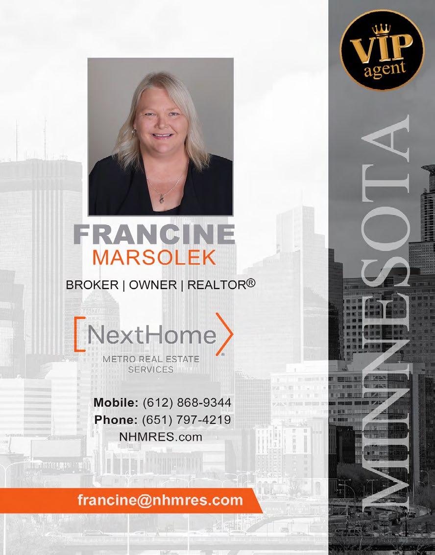 Ready to find your dream home in Minnesota? Connect with Francine Marsolek today for expert guidance and personalized service. Call her at 612.868.9344 or 651.797.4219, visit her website at NHMRES.com, or email her at Francine@ nhmres.com. Start your home-buying journey with a trusted professional by your side!