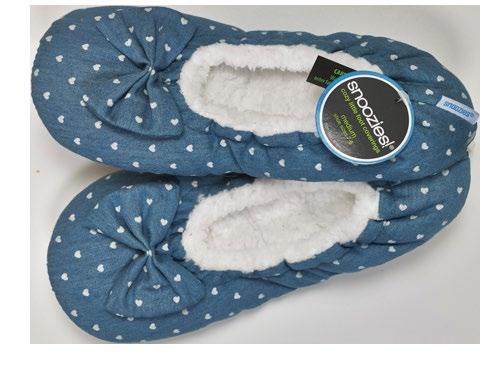 Ballet-style slippers from Snoozies in denim print. Distributed by Cross Border Sales Agency, 905-417-6332, www.crossbordersalesltd.com