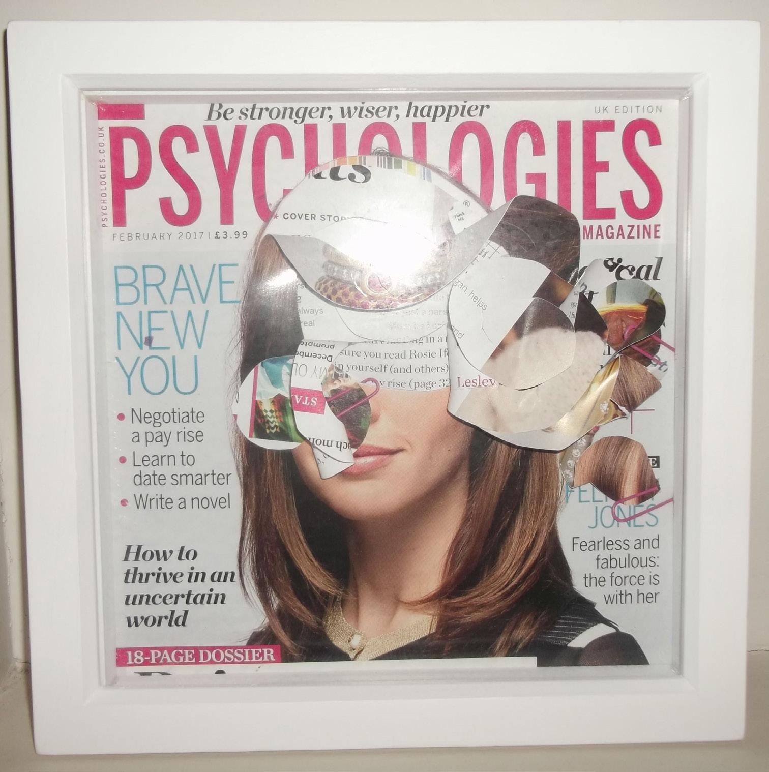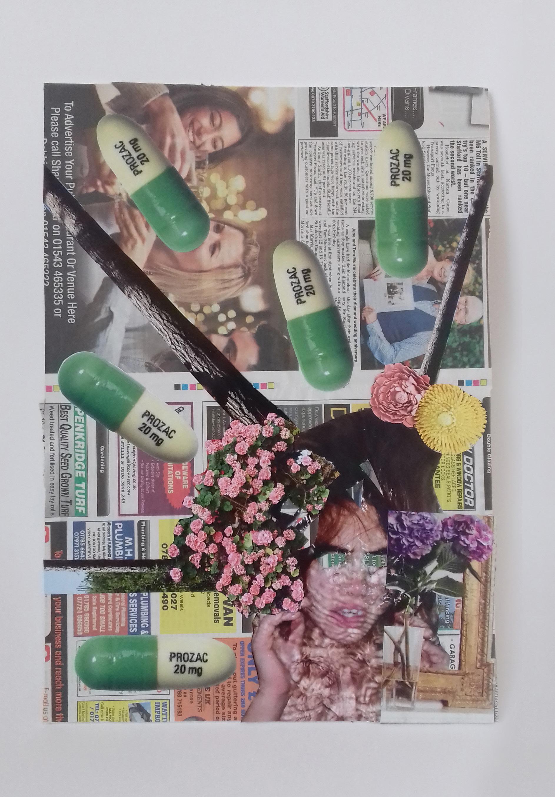 I’ve made the artwork opposite to show how my brain might look when I’m unwell with psychosis. I call these collages the ‘brain surgery series’ as to make them I take a scalpel to pictures of people in magazines! Since 1999 I’ve taken different measures of antipsychotic medication to treat psychosis or the brain explosions you see in my artwork and this means that, today, I’m able to live my life without too many symptoms of my illness. For me, I don’t worry too much about side effects as they’ve always been outweighed by the benefits of taking pills: being able to get out and about, being able to take part in paid work,