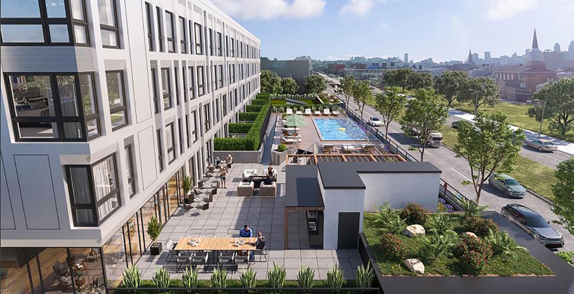 New Construction, 6 story, mixed-use building with 195 rental units, roof deck and interior amenity areas throughout.