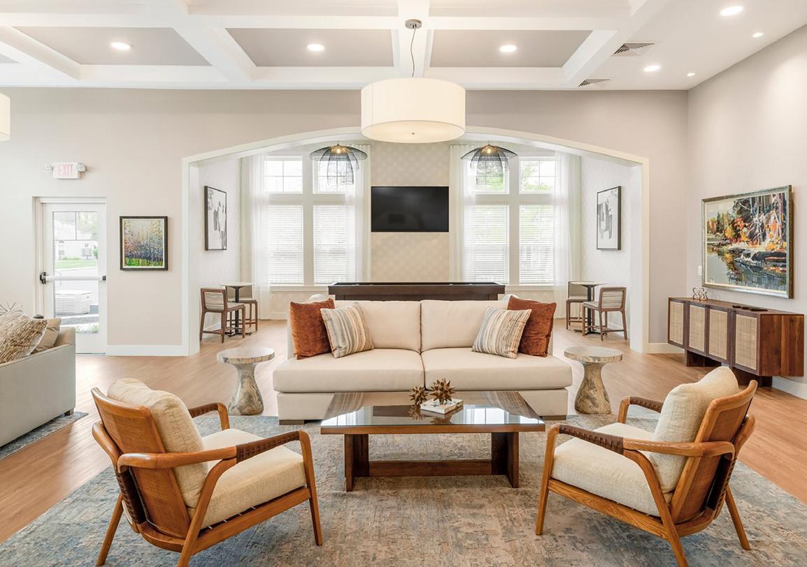 New construction clubhouse including leasing offices, club room, communications lounge, kitchenette, game room, and fitness center.