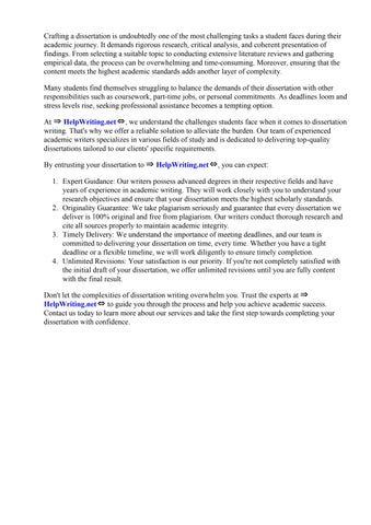 Don't let the complexities of dissertation writing overwhelm you. Trust the experts at ⇒ HelpWriting.net⇔ to guide you through the process and help you achieve academic success. Contact us today to learn more about our services and take the first step towards completing your dissertation with confidence.