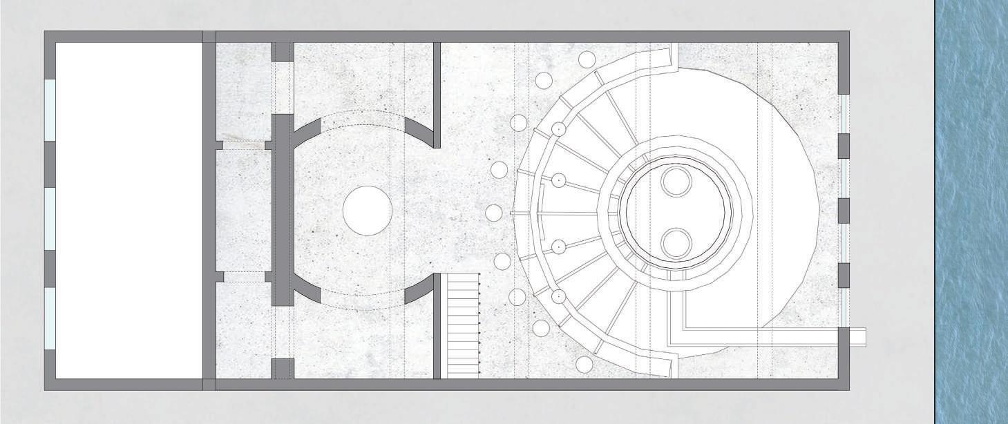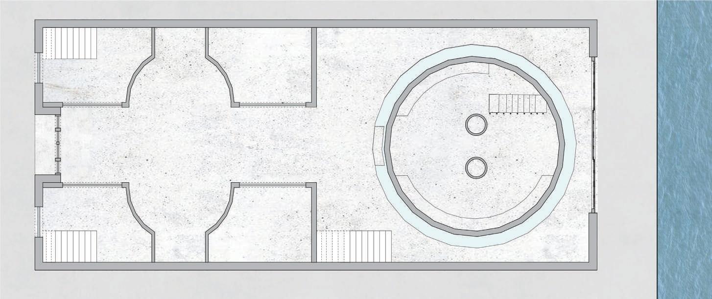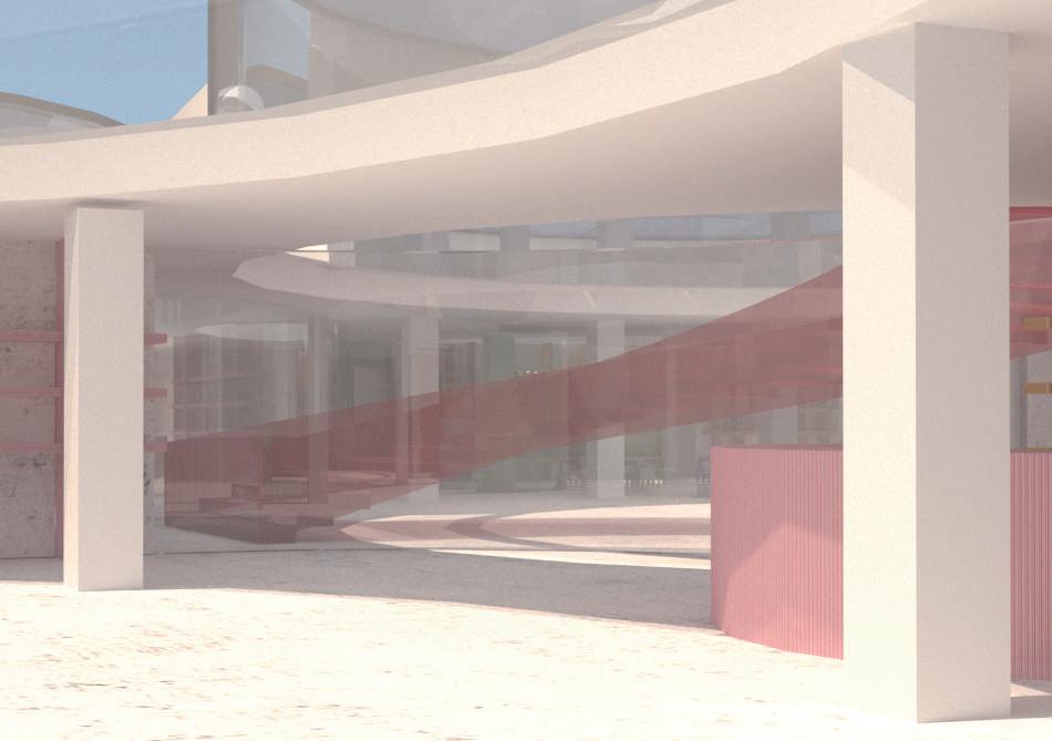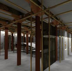 室内布局的几何原理源自于拆除天花板上的圆圈,并将其分割并与原有墙壁 相结合。由于陶瓷市场应该是一个能够促进人们对陶瓷艺术产生兴趣的、充满 活力的交流空间,因此空间的多样性至关重要。