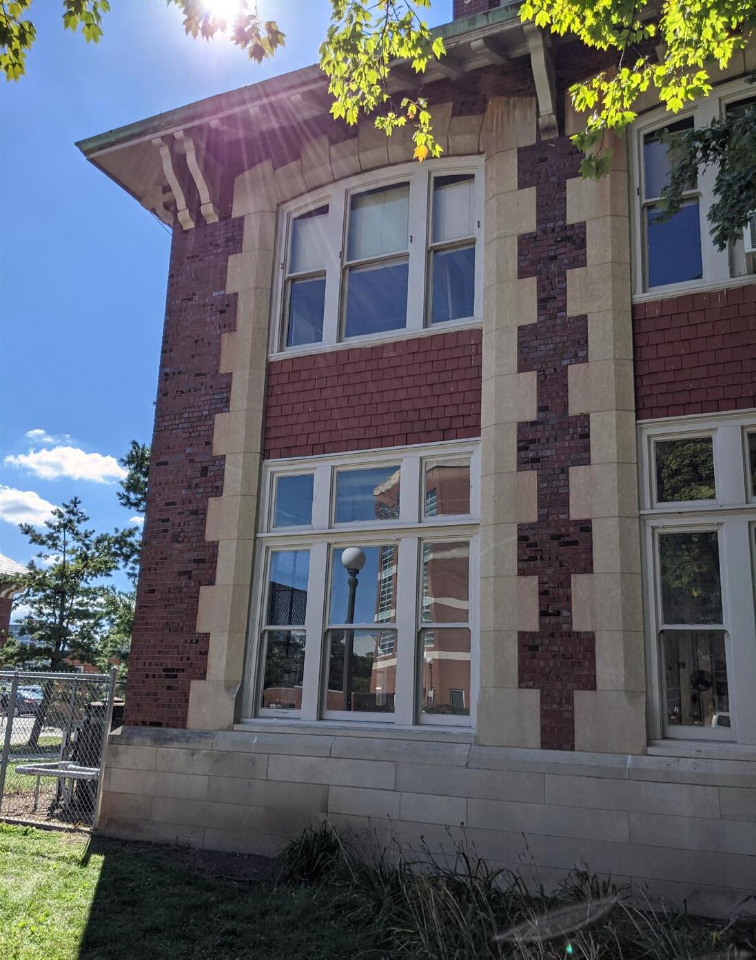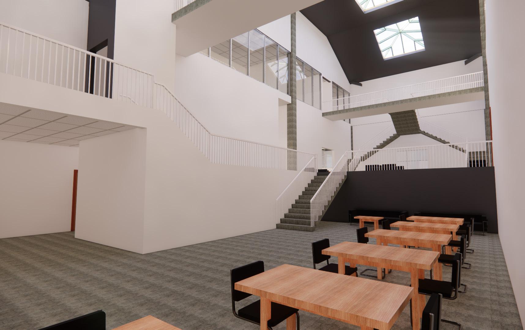 Each rotated section has a lightwell surrounded by bookshelves that allows visitors to look down from the upper floors and doubles as a bench with an excellent view of Champaign’s train station. This along with a cafe and seating area on the first floor gives the building’s visitors a place to sit, relax, and read their books.