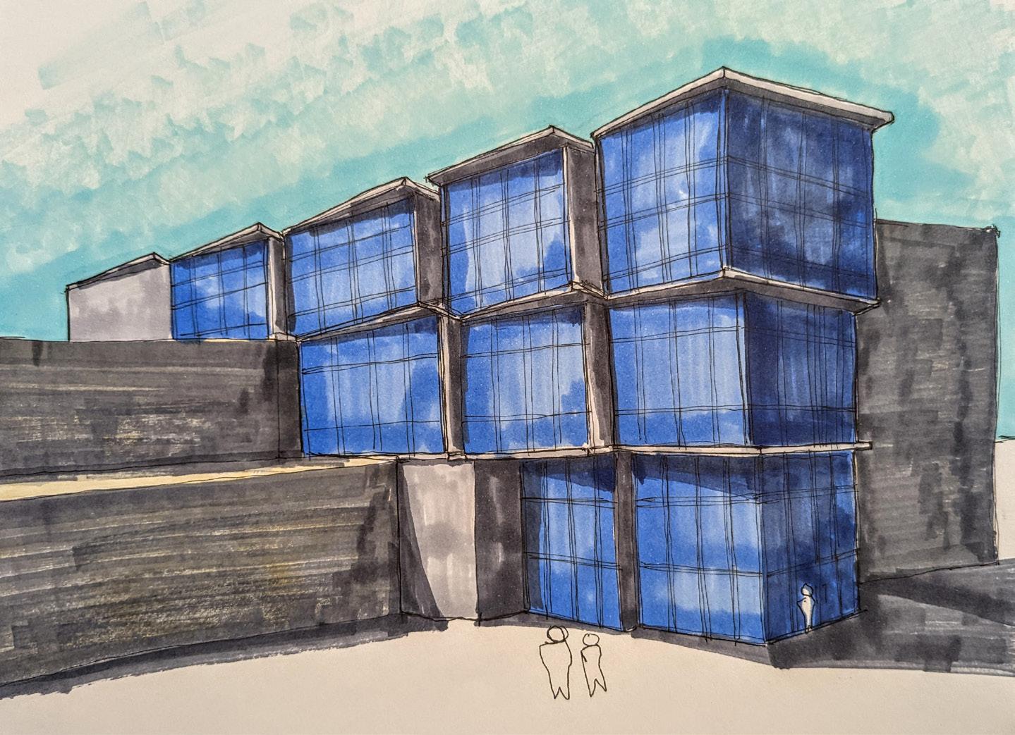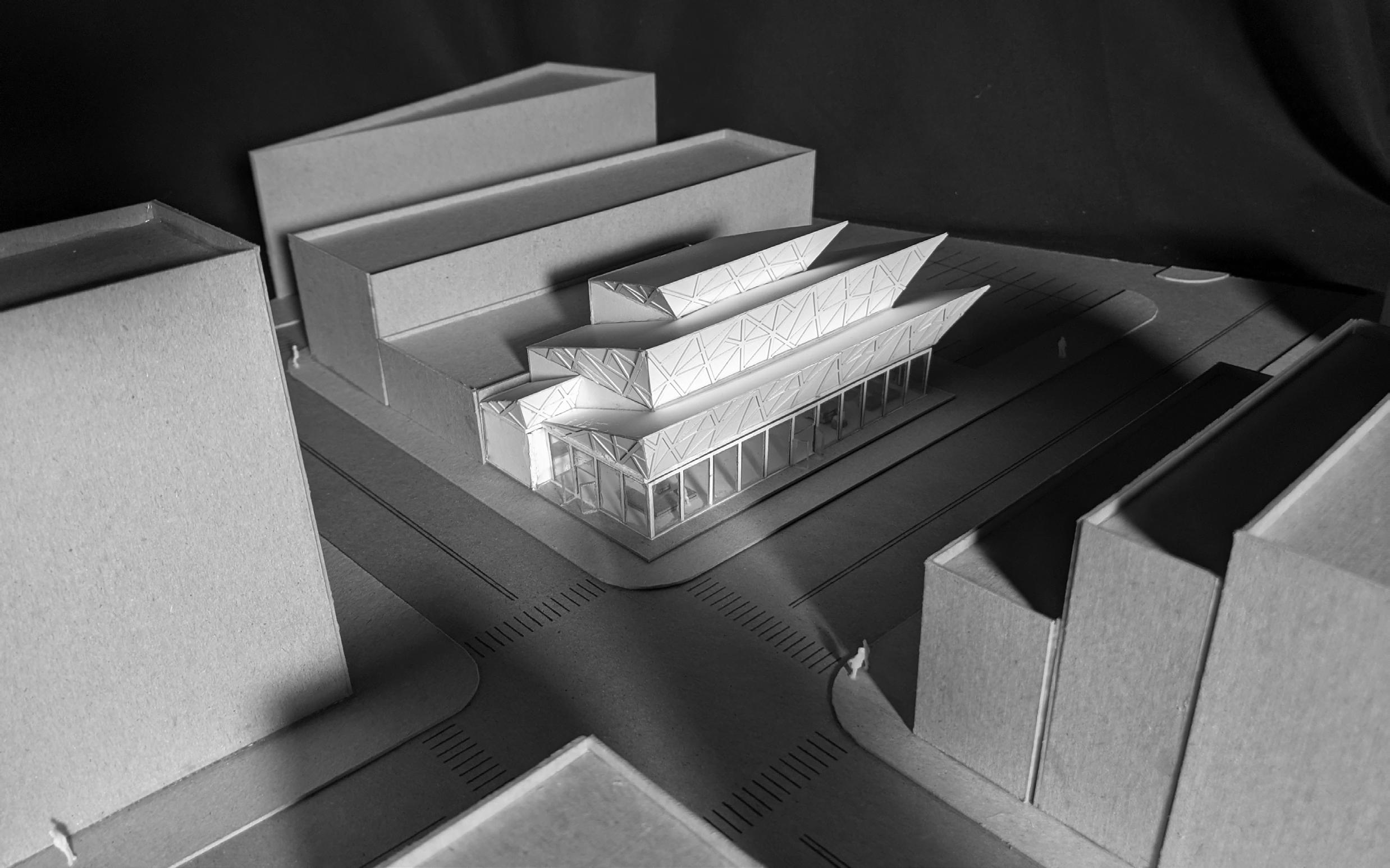 For this project we were tasked with designing a performance hall on the corner of W Jackson Blvd and S Green St in Chicago. Since the site was on the edge of Greektown, I took inspiration from classical Greek amphitheaters and odeons in my design. I used the radial seating that these theaters were known for to dictate both the form and structure of my building, with an arcade of columns and arches that support the theater above. This radial scheme is constrained within the rectangular boundary of the site and only breaks at the entrance and ticket booth to emphasize the corner location. This attractive landmark serves to welcome visitors into this culturally rich neighborhood.
