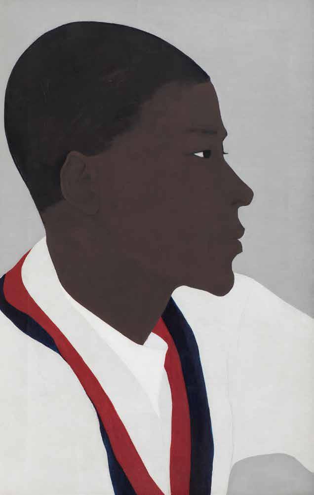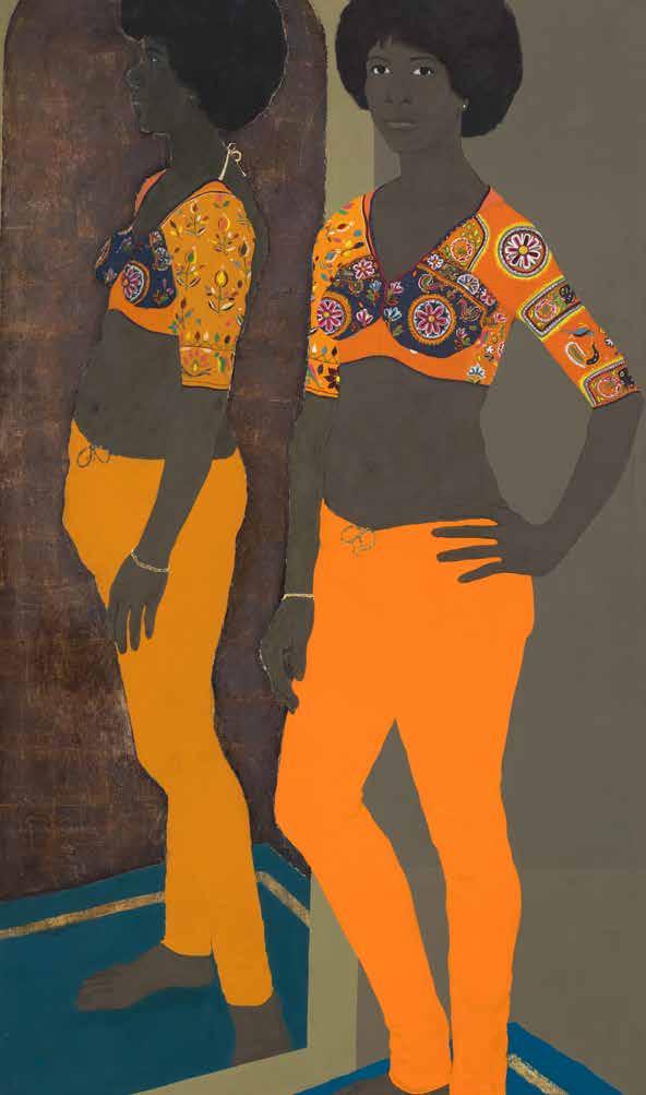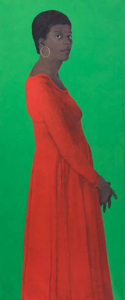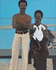 reflection in the mirror. With this trope of a split perspective, Marcus hedges against any reductive consumption of her subject’s personhood; the mirror here is allegorized as a site for projection and possibility. Marcus portrayed everyday people with the same tenderness and dignity as she did her family and circle of artist friends, as evidenced by an exuberant portrait of a young African American family, Tyna and Alvin, and their young baby Marcus created in Provincetown, where she summered and made works for two decades.5 Though little is known about her friendship with the family, Marcus depicted an alternative image of black families that ran counter to stereotypes of brokenness and poverty plaguing popular culture and perpetuating cycles of social and economic inequity, opting instead for a radical ordinariness in her treatment of black bodies. She depicted the family together, prideful and joyful against a backdrop of the Cape’s familiar cerulean blue sky.