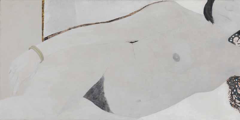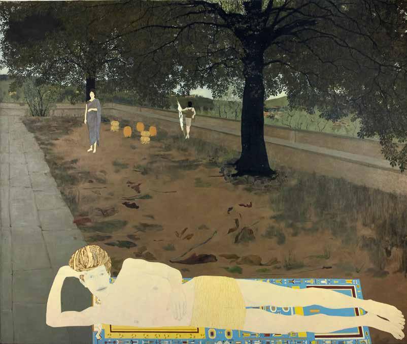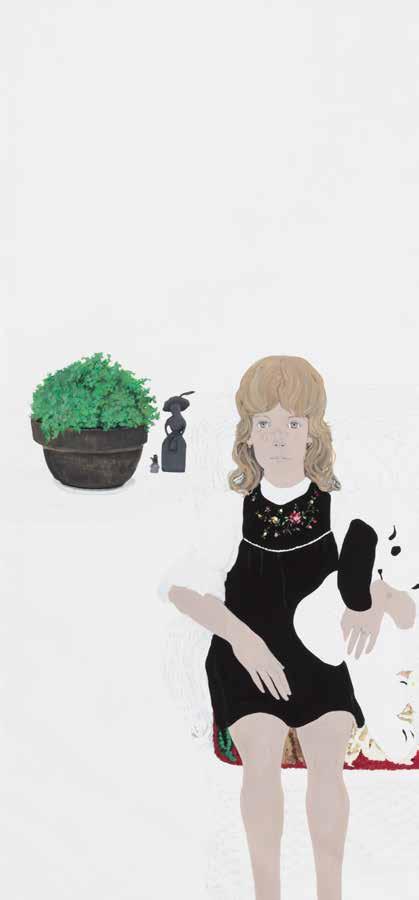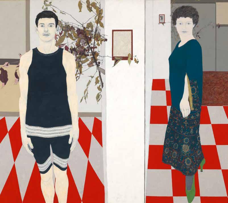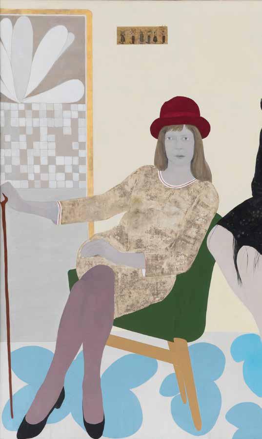 Frieze: The Porch 1964, (p. 28) where Marcus adapts the allegorical and compositional structure of Courbet’s L’Atelier. From left, Marcus depicts her friends – literary critic Jill Johnston and painter Barbara Forst, at center a mature Marcus, draped in an elegant floral cloak, and on the far right, in juxtaposition, her father and herself as a young girl, reproduced from a family photograph now at human scale. There is little interaction between the women; instead they are in isolated poses, each confronting the viewer. Here Marcus positions herself as maestro of a universe that centers women as arbiters of cultural production. Folding time onto itself, she makes the canvas capacious enough to hold past and present together.