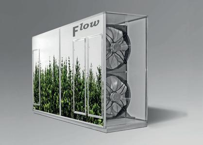 Flow ist ein Rückkühler, der auf dem Prinzip der Wasserverdunstung beruht. Auf seine Rohre wird Stadt- oder Regenwasser versprüht. Dabei entsteht Verdunstungskälte. Flow stellt die nötige Kühlenergie ohne Kompressionskältemaschine zur Verfügung. Er ist exakt auf die Anforderungen von Rio-Therm, Cool-Top, CoolRack und Top-Cooler abgestimmt.