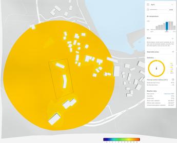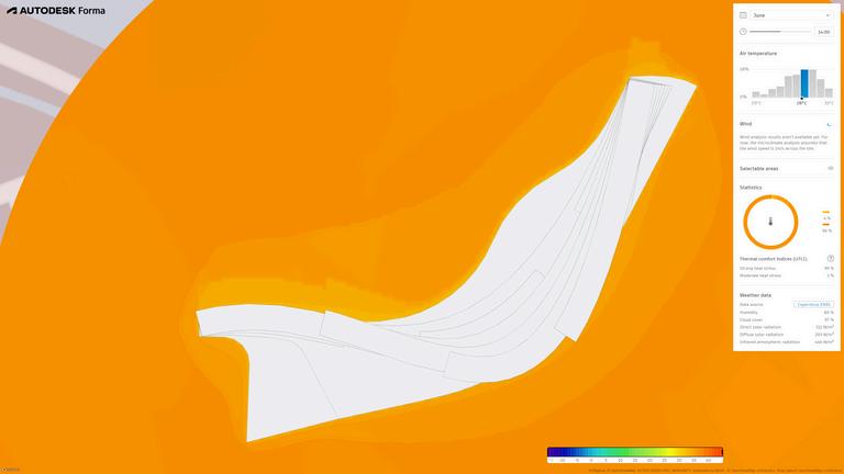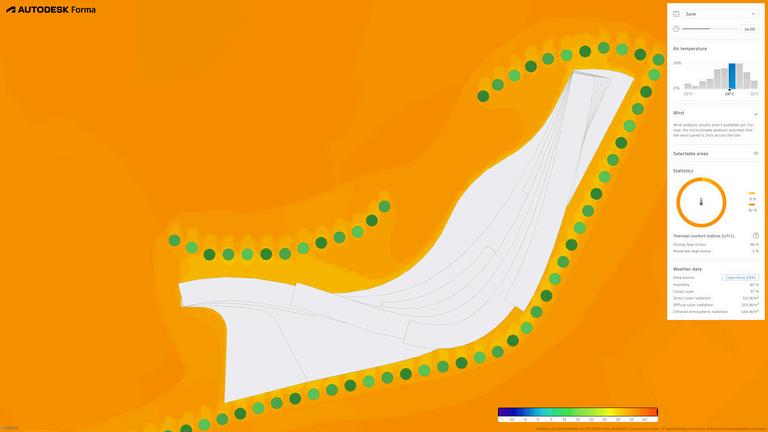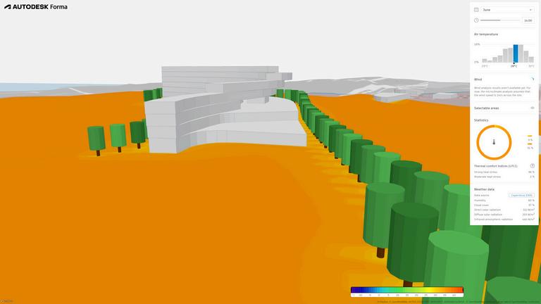 Using Forma, we can test and observe the implementation of different design strategies and their effects on the site. Using the street tree line and additional vegetation, it is possible to extend the affected zones of reduced temperature, creating pockets of comfort and courtyards for activities between the building and tree line, water features can further be implemented to increase the contrast between the temperatures of these areas