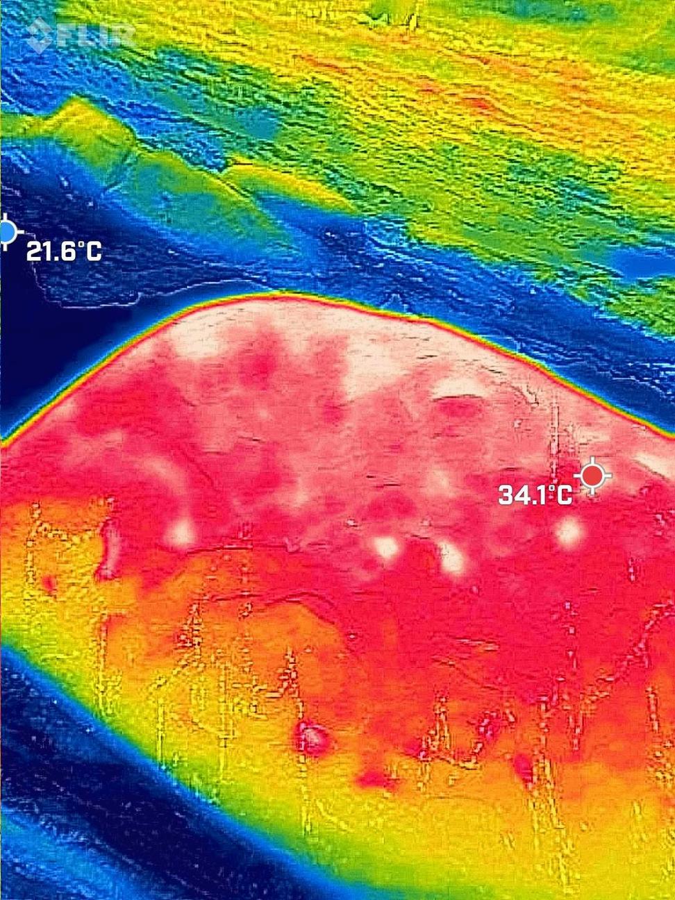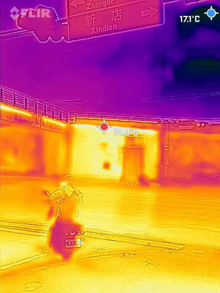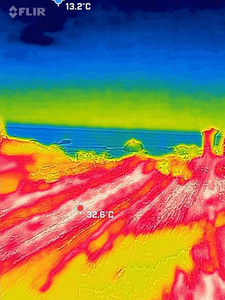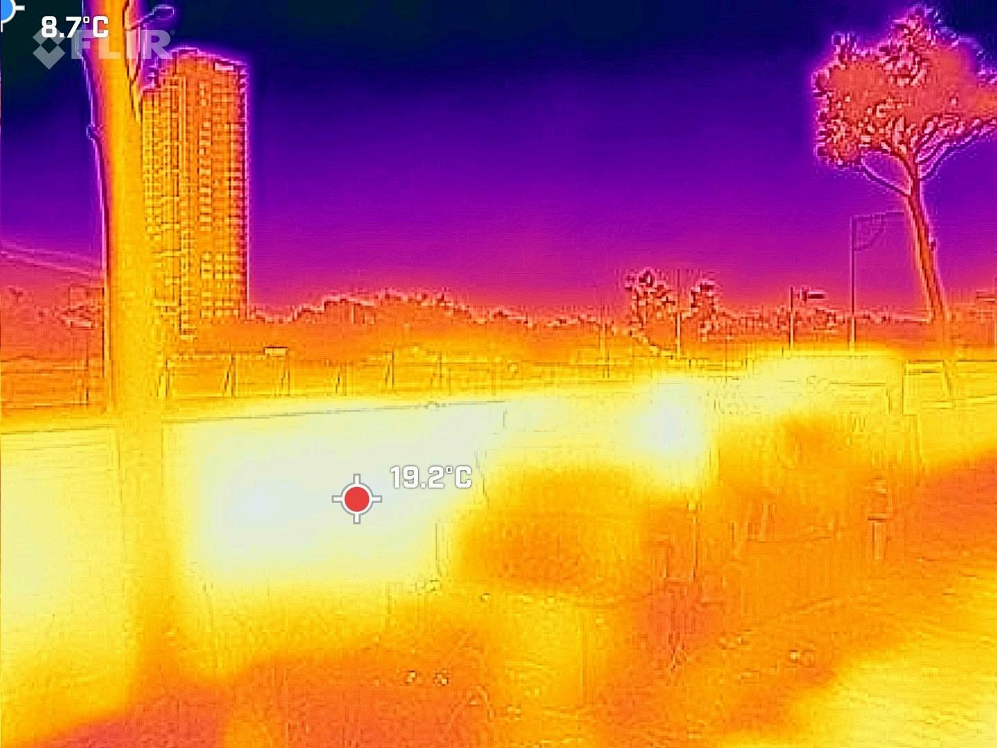 What can be observed in the top three thermal images is the distribution of heat throughout the environment In the first photo, the asphalt road surface is shown to hold the most heat during the day being at nineteen degrees Celsius, a significant amount hotter than the surrounding environment especially the areas with vegetation, appearing at dark orange colour, the sky is very clearly seen to be the coolest part in all thermal images, and the radiating heat off the ground can be clearly observed as the gradient of colour turning from orange to dark purple. Interestingly the lighter shaded concrete blocks have a lower temperature compared to the dark asphalt road surface