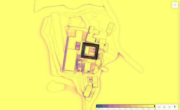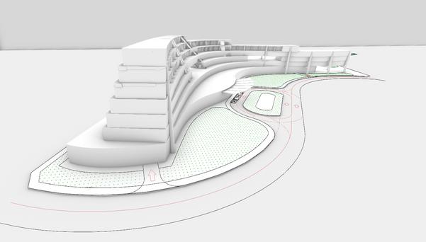 Microclimate analysis of the site shows the effects of having the building mass located on the site, and how it affects the surrounding temperature, creating zones of lower, more comfortable exterior spaces as a consequence of the shade cast by the building The programme being an international resort hotel with a heavy emphasis on spaces for exterior activities, requires larger areas with lower temperatures and shade