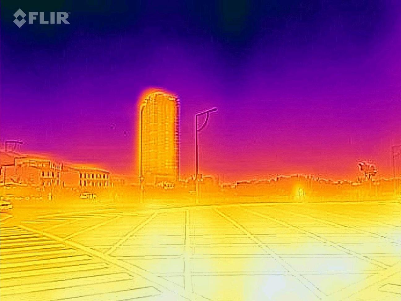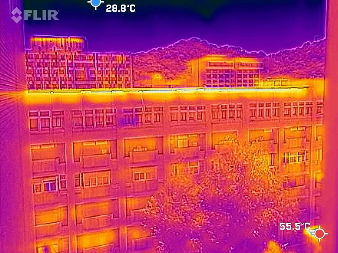 During the daytime, the building shows a similar temperature to the surrounding area, but nighttime photos reveal a significant difference between the building and the surrounding temperatures
