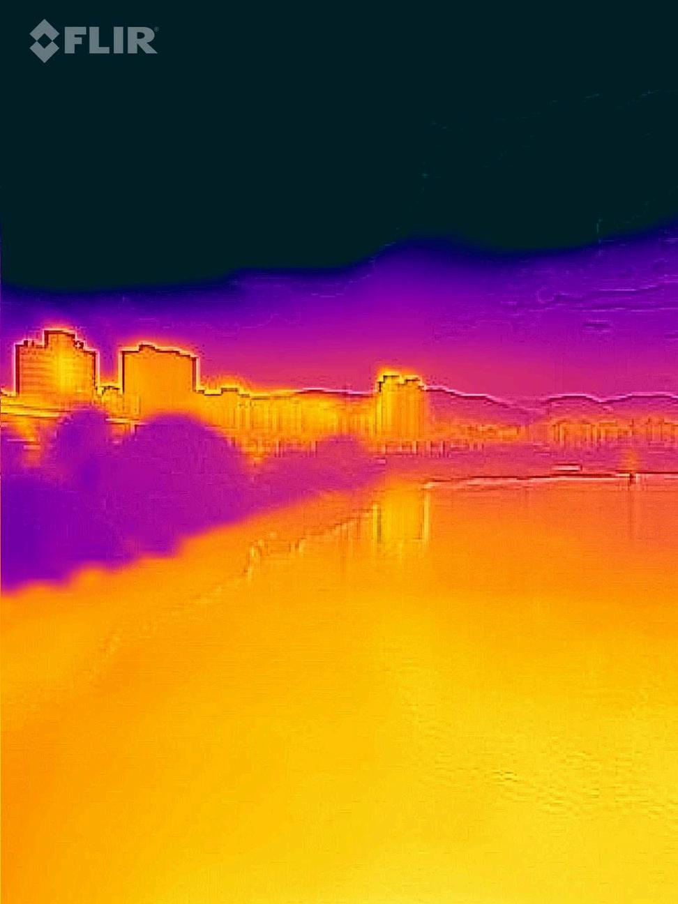 The water surface temperature are colder than the buildings and surrounding environment in the daytime and nightime photos