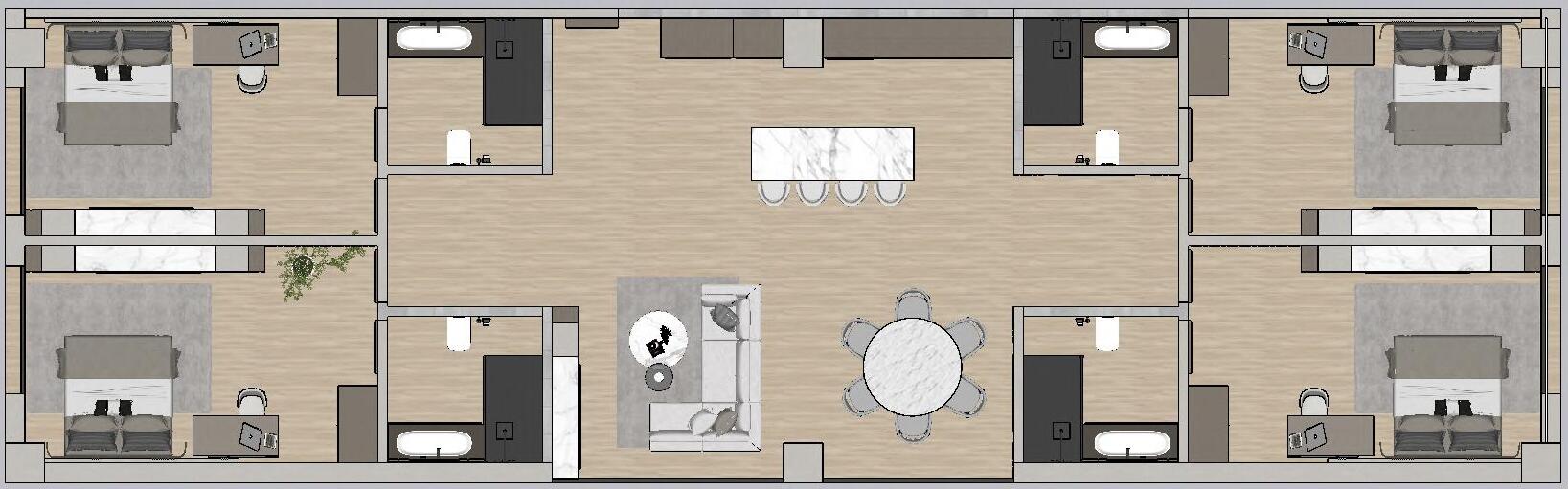 The shape of the building is born from the representation of curves in our context by its hills and mountains and how they embrace and protect our city, this symbolizes the idea of how our building seeks to create that same effect with women The project has 98 rooms of 3 different types, garden area and central patio, amenities and commercial premises In addition, all areas are decorated with comfortable furniture and striking vegetation to create a fluid relationship between its interior and exterior spaces