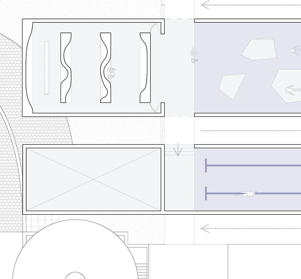 The four bars appear as monolithic masses while the connecting circulation ramps, covered almost e tirely in glazing, provide a counterpoint to the interiority felt in the volumes they unite. Walking in through the NW entrance, visitors face an enclosed perimeter with sporadic gardens and light rhythmically falling from the roof. As they move on through dematerialized circulation spaces, they are faced with the chan ing rooms, and then, in the following two volumes with the large recreational pool, a series of saunas, thermal pools, lap pool, and an accessible courtyard with seating space – all drenched in rhythmic light falling from the skylights.