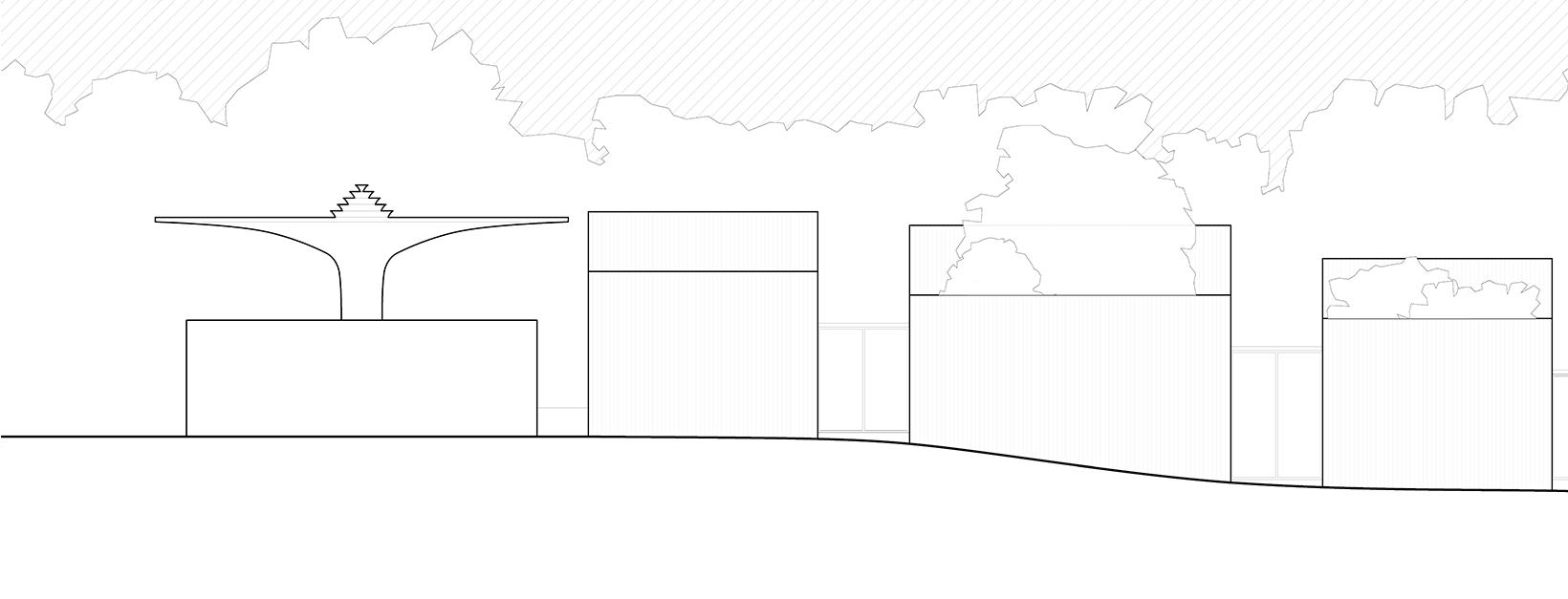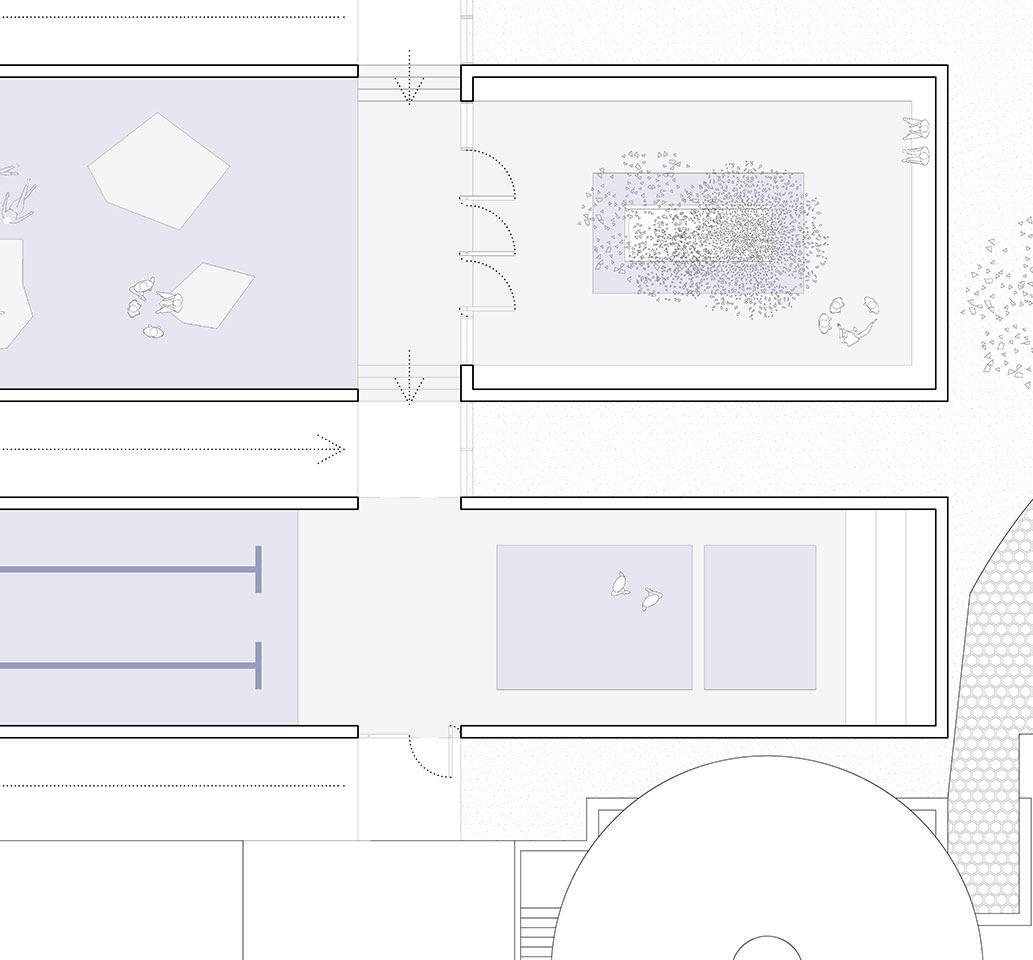 The four proposed volumes are interconnected with a sequence of ramps that also connect the new e trance on the North-West facade to the Astoria Pool and vice versa, integrating the water treatment building as a fifth volume.