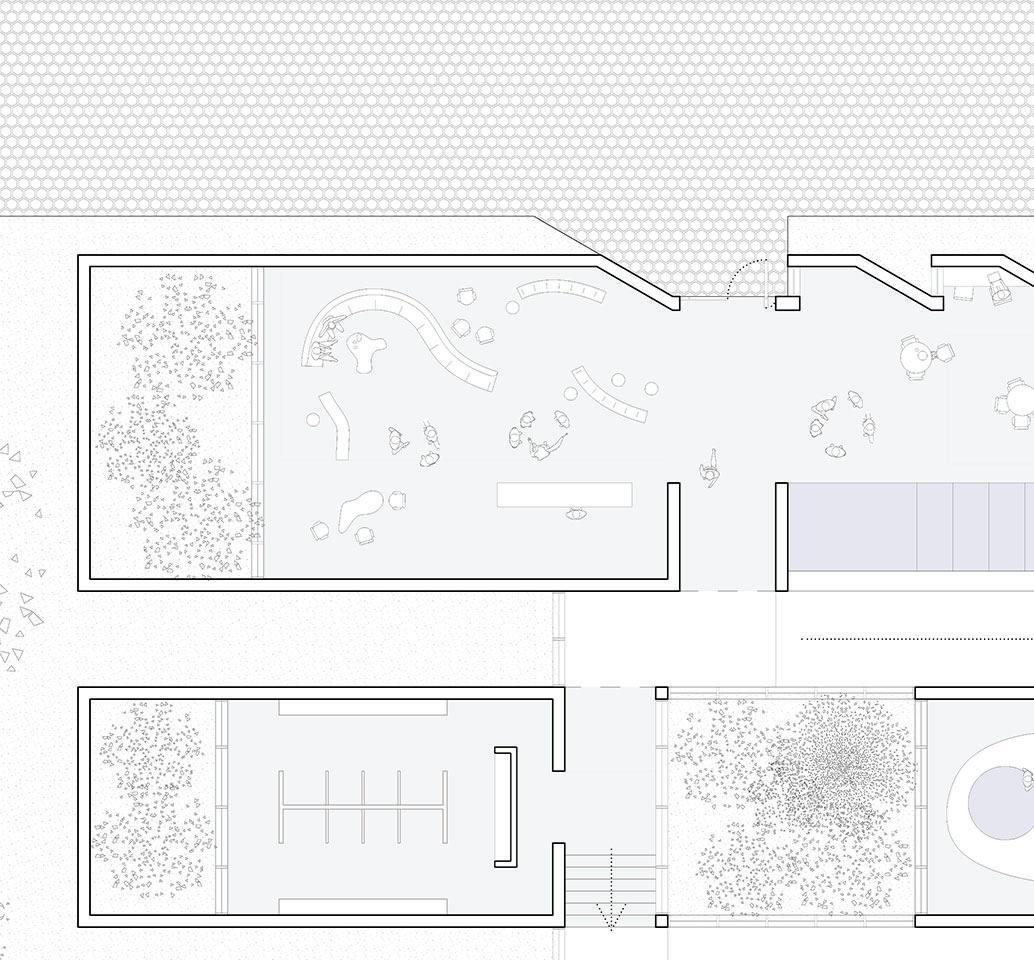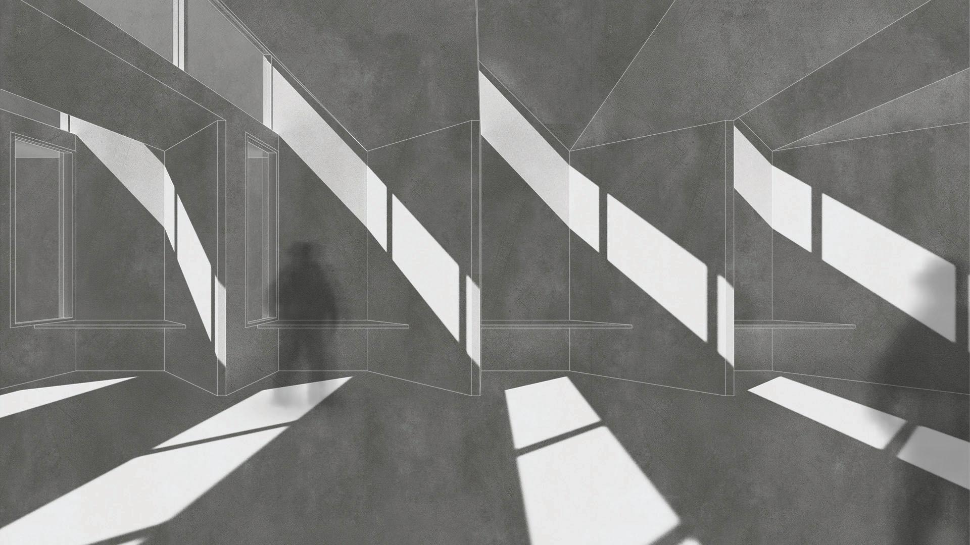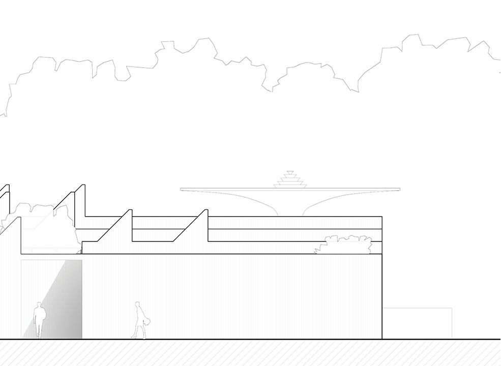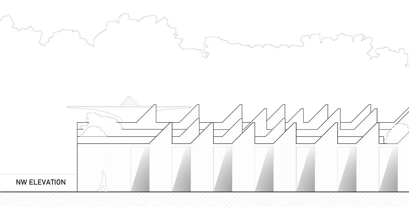 The building opens itself up to the exterior in three different ways. The sawtooth roofs provide skylights that generate dynamic light and shadow conditions throughout the day and the seasons, while the cour yards adjacent to the programs allow indirect light and visual connections between the bars. The third strategy can be seen in the community program space, and it allows indirect light, while framing views for the seating areas.