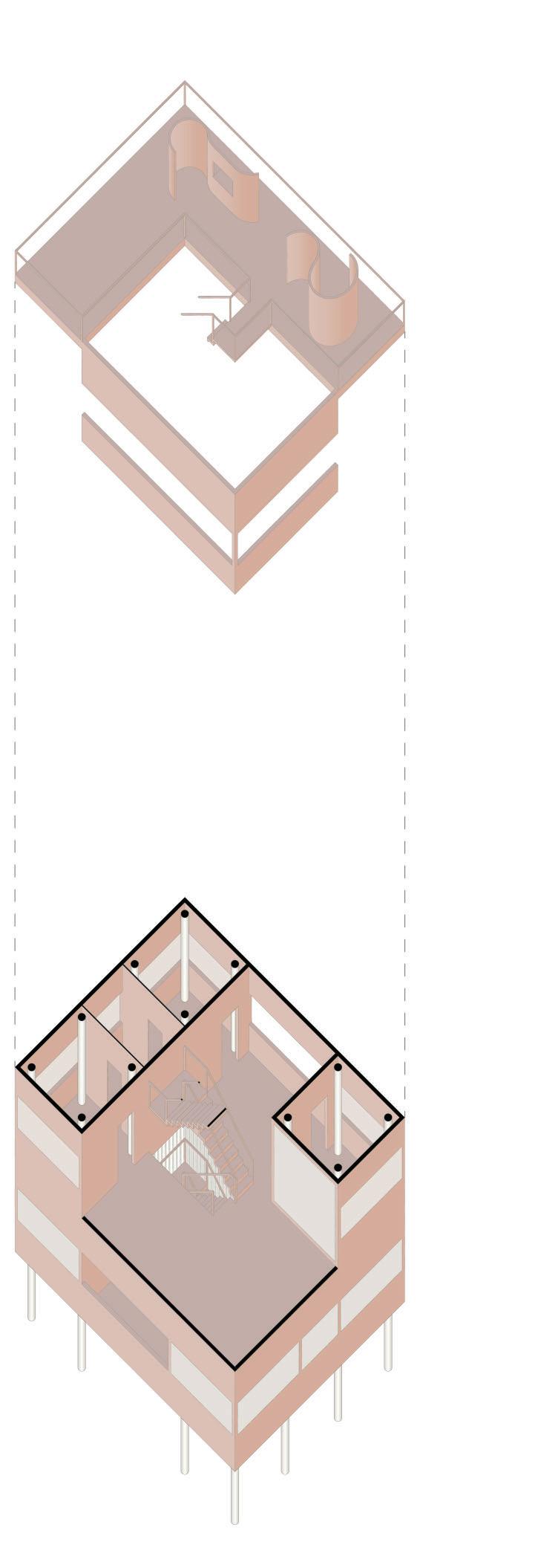 The bottom levels are the two bedrooms, the lowest one for the two women, and the second one for the three male students. This organization allows the women’s bedroom to have a slightly higher degree of privacy and a more spacious shared bathroom. The third level hosts a common studio space with a fixed desk organization around the perimeter, and a wide flexible space in between. This level also contains the entrance to the building. The next floor works as a dining and kitchen area, and the last one is a half open-air social area.