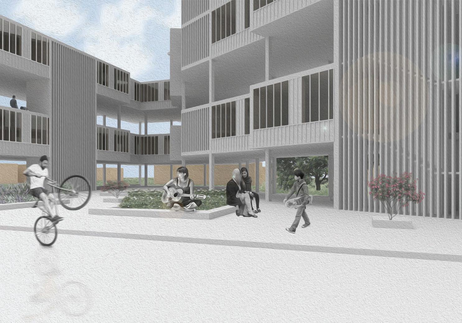 Furthermore, private and common use spaces are evenly distributed between the two main volumes of the project, creating a balanced promenade for every one of the residents, which takes them from one point to another, through a series of different atmospheres.