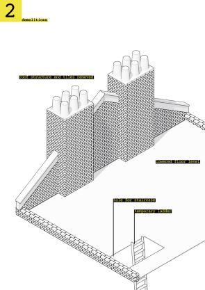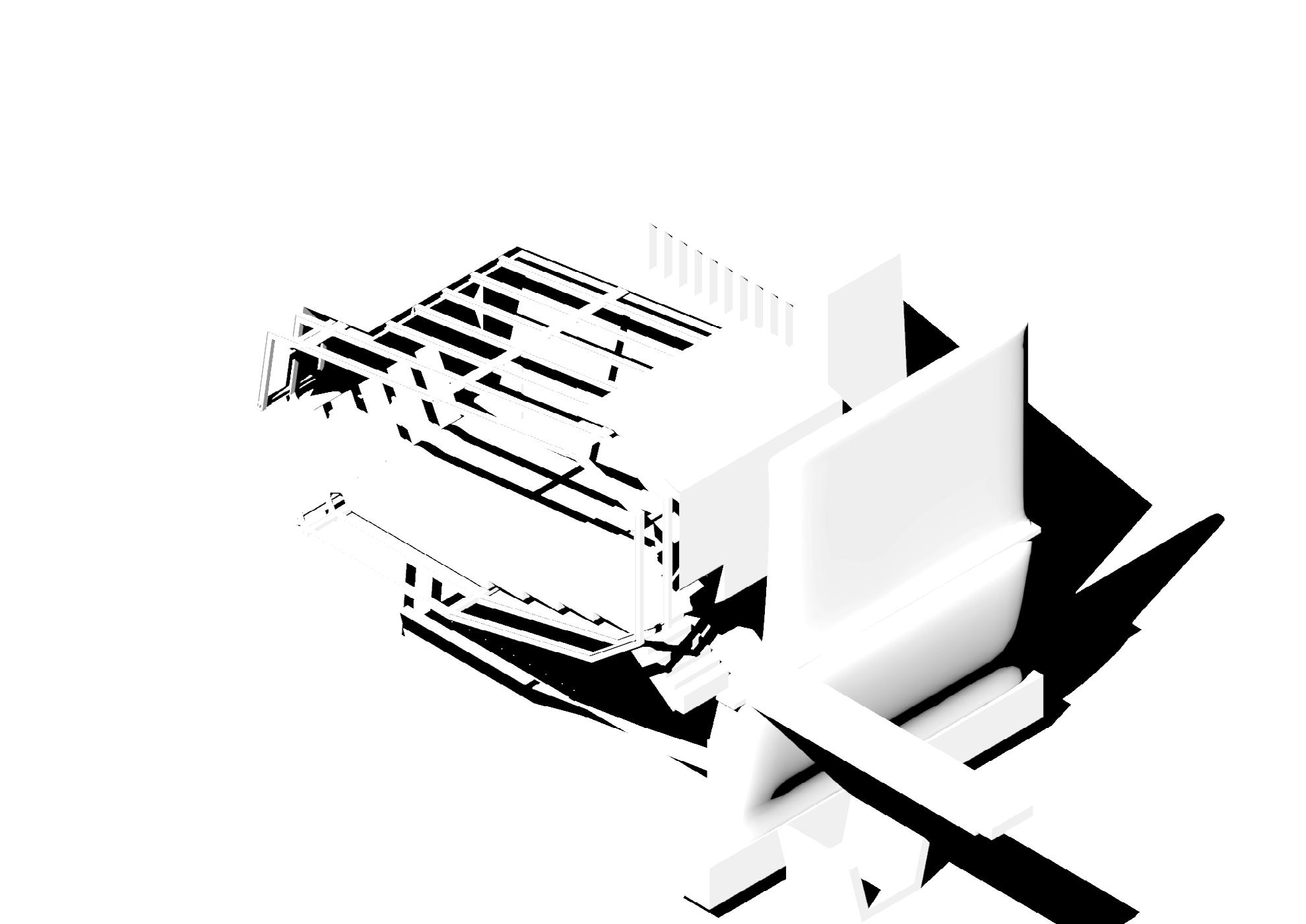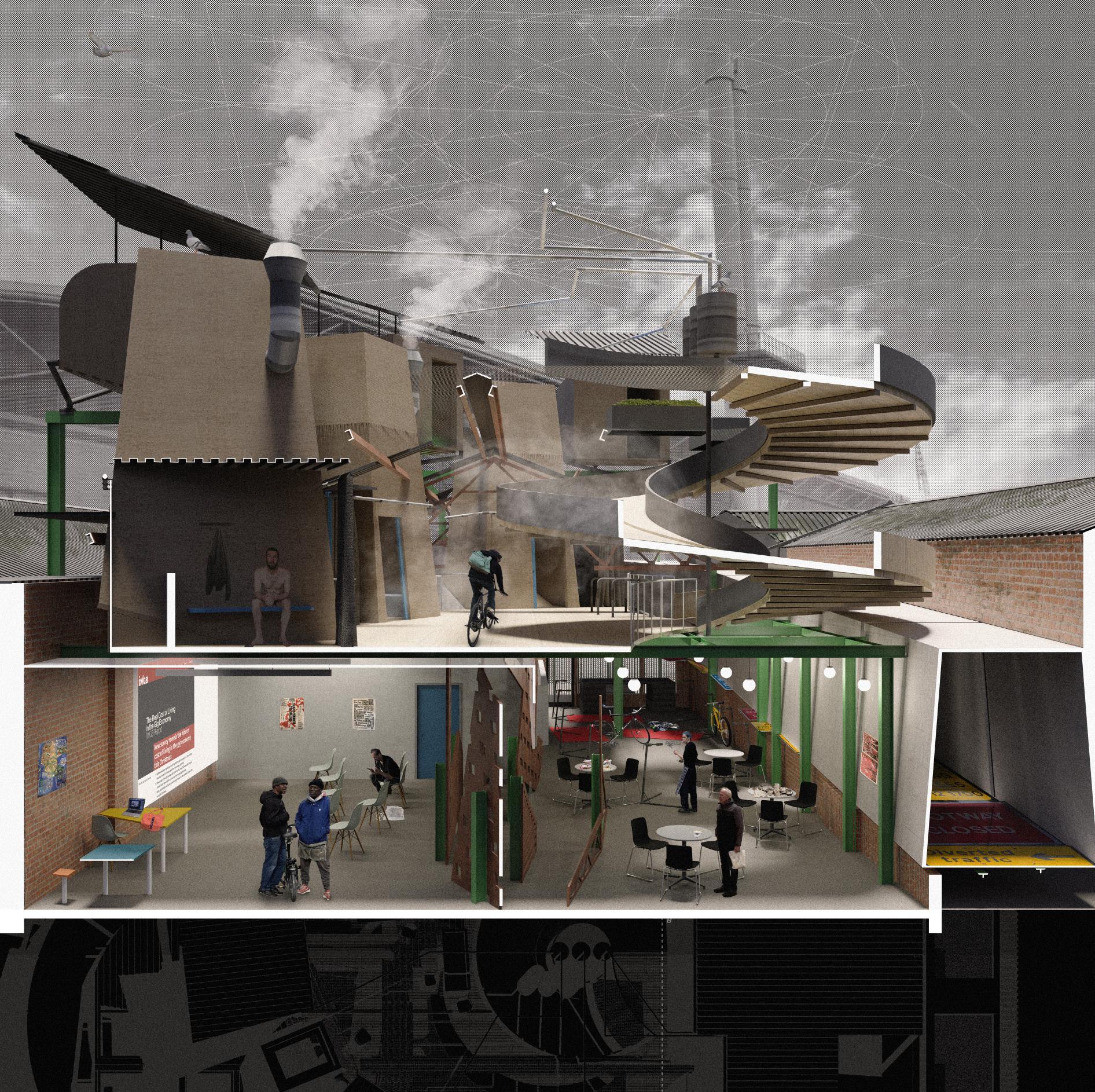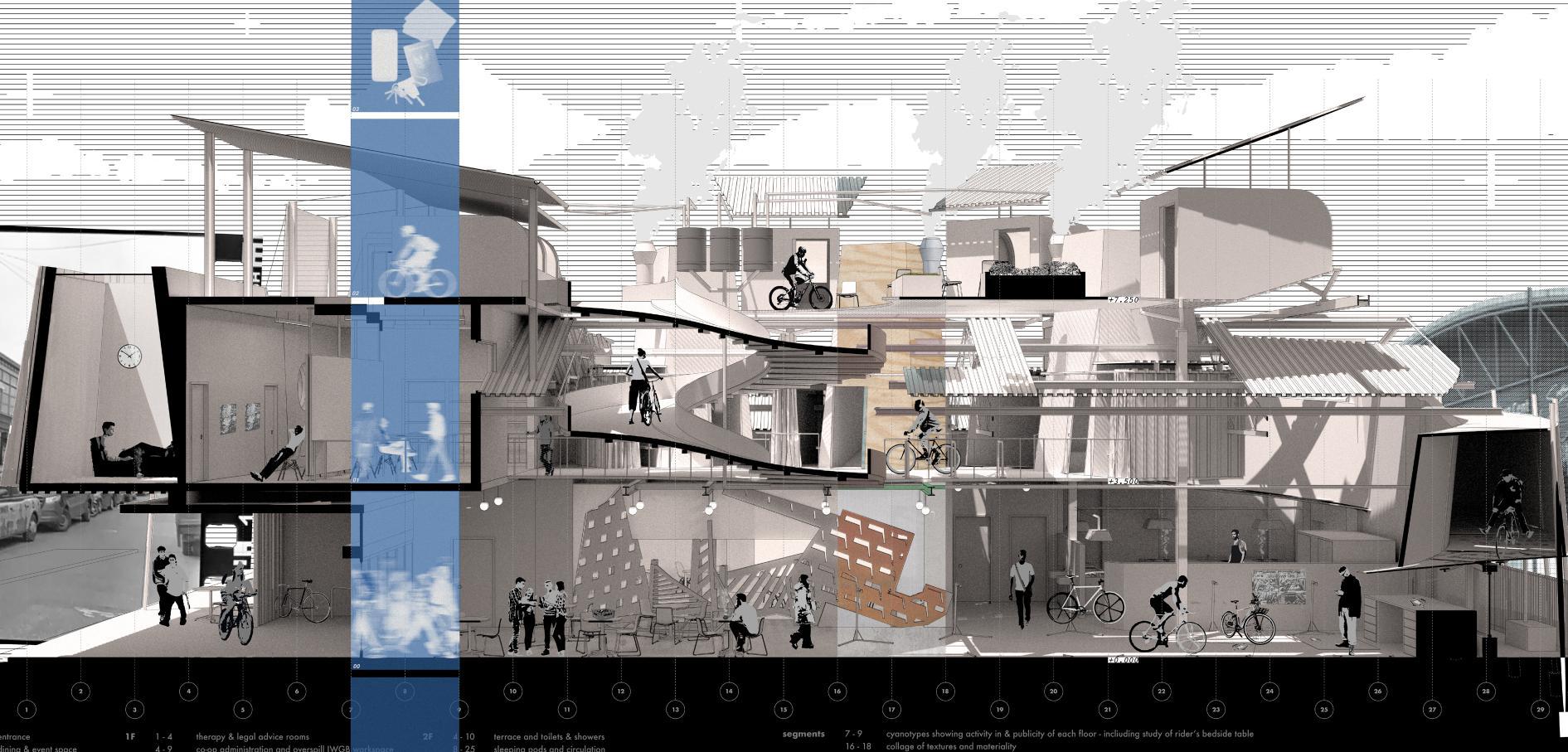 The proposal retains the existing kitchen (now to be run as a community kitchen), as well as incorporating bike repair facilities, a street-facing space for the IWGB union, emergency accommodation for riders and saunas for relaxation and easing the muscular strain that delivery entails. The whole building is accessible by bicycle, superimposing onto the existing building a network of ramps, gangways and bike racks.