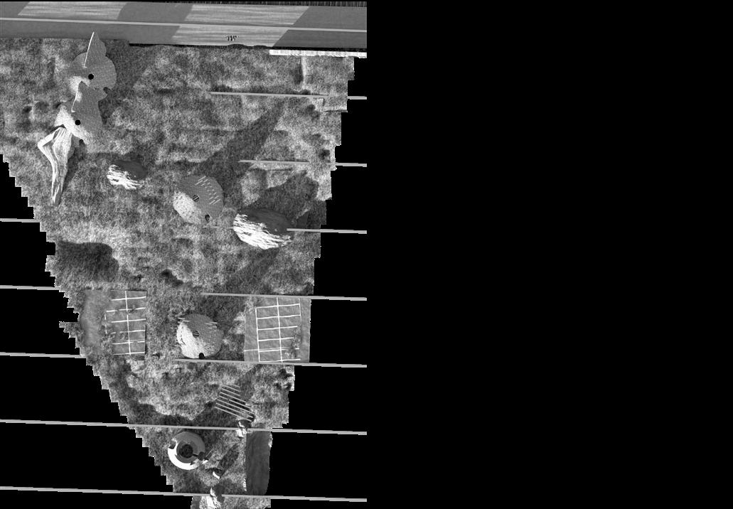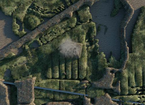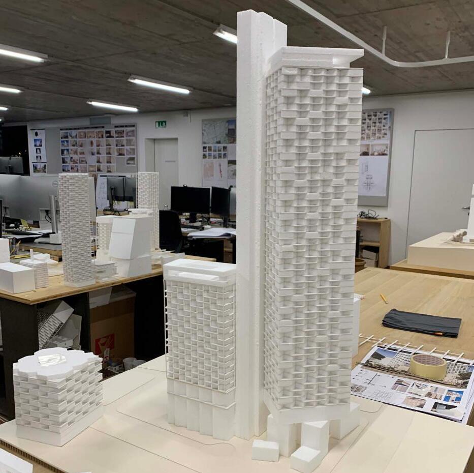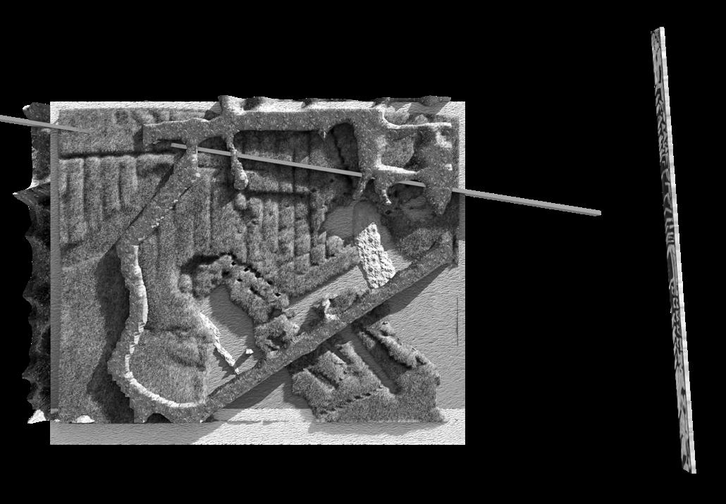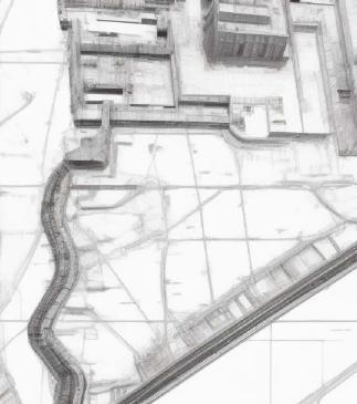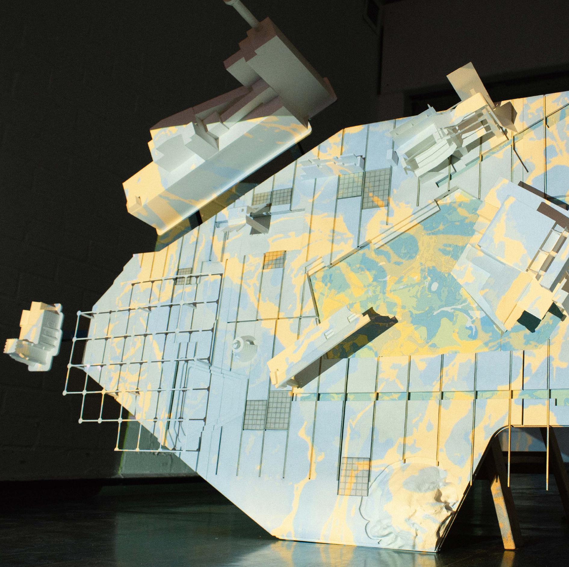 Landscape / fragment model - projection onto fragmented and varied scale model of site and proposal. Left is St Clement’s church, top is Procter & Gamble factory, grids and projection describe landscape treatment and architectural fragments rise above the ground plane.