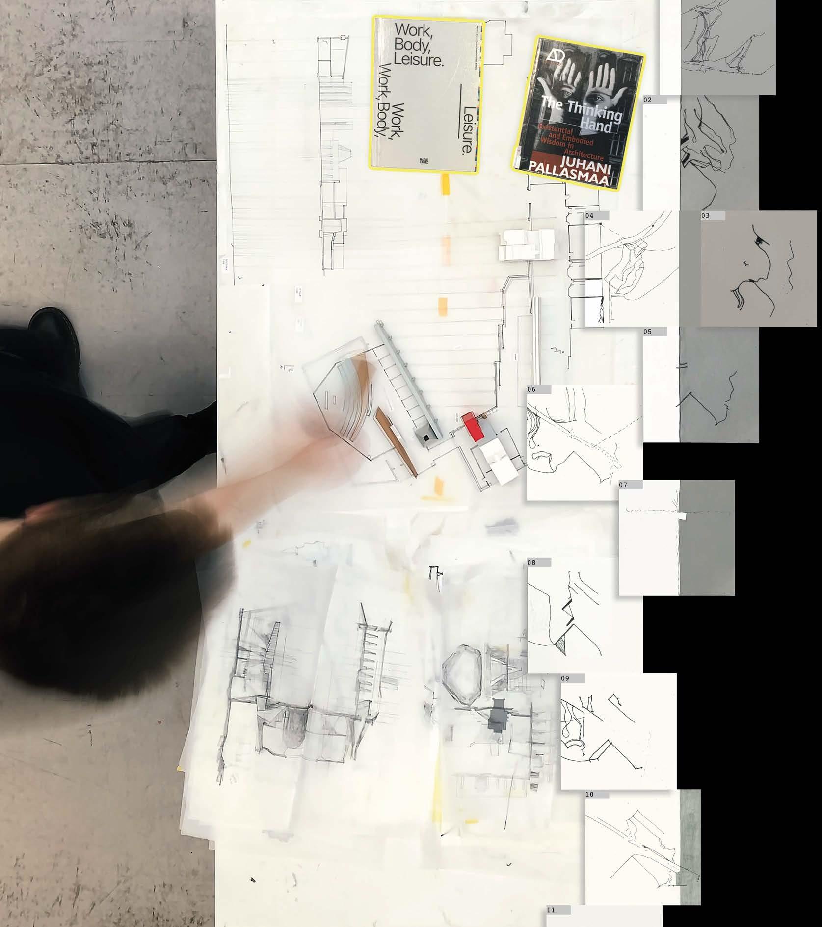 A table of ‘residue’ left by designing by hand - these sketches and models become datasets upon which AI models are trained, effectively automating the hand of the architect, acting as a design voice to subvert a human designer’s logical design process. Juhani Pallasmaa describes an embodied wisdom in the hand of the architect - does an AI trained on this hand carry the same wisdom?