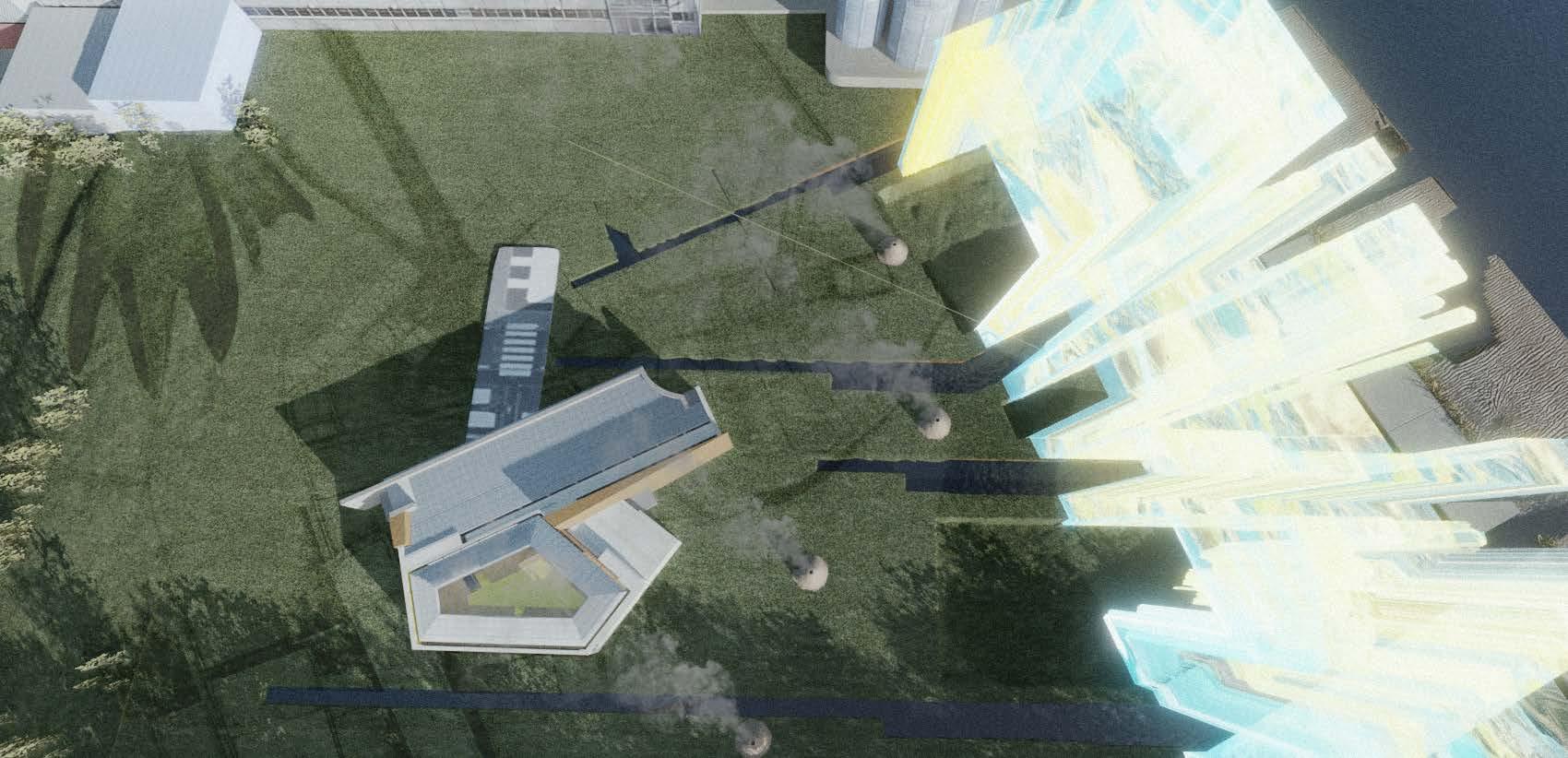 The proposal is a new city hall for an independent, self-governing Grays, where the local community gains stewardship of the landscape and engages in debate over the construction, conservation and rewilding of the Thames estuary. An empty political testbed is left following the council’s 2022 bankruptcy, allowing a post-scarcity economic system to be established, similar to Aaron Bastani’s concept of Fully Automated Luxury Communism. Situating itself between the Procter & Gamble soap factory and the 13th Century St Clement’s church, the city hall acts as a base point for resistance against further industrialisation, mediating the boundary between production and conservation.