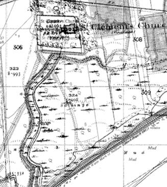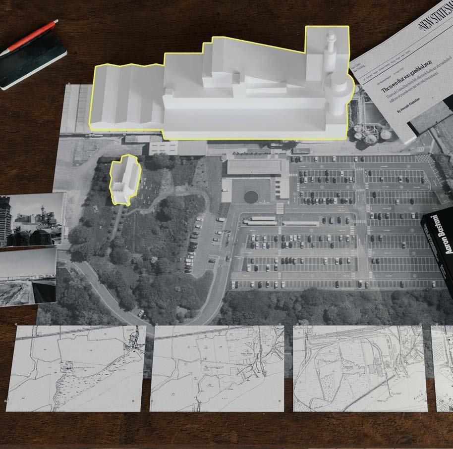 Landscape / fragment model - projection onto fragmented and varied scale model of site and proposal. Left is St Clement’s church, top is Procter & Gamble factory, grids and projection describe landscape treatment and architectural fragments rise above the ground plane.