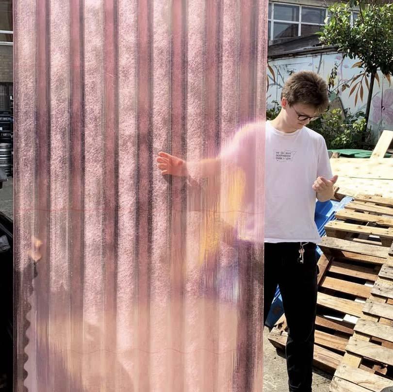 Testing vinyl application to GRP panels - these were wrapped individually with translucent pink and blue vinyl