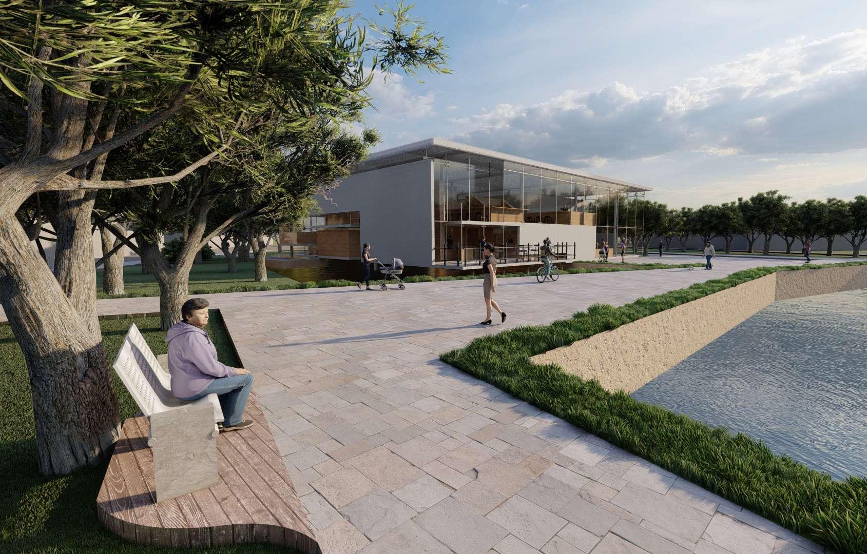 Dentro de la intervención de la biblioteca se tuvo que extender el lago para mimetizar con el proyecto ,con la finalidad de aparentar flotar al terreno y crear espejo de agua en la transparencia de los planos .
