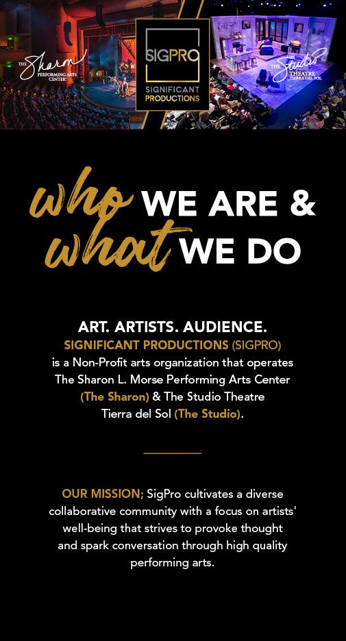 Significant Productions is a registered 501(c)(3) nonprofit public charity that operates The Sharon L. Morse Performing Arts Center (The Sharon) and The Studio Theatre Tierra del Sol (The Studio).