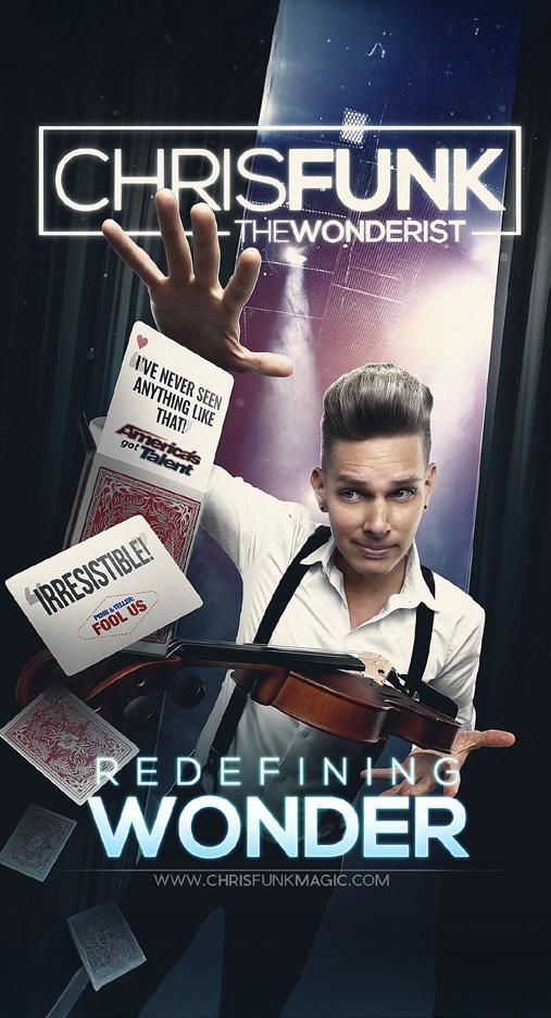 CHRIS FUNK’S REDEFINING WONDER is an engaging multimedia experience that has audiences talking and scratching their heads for years to come. Finally, a MAGIC SHOW WITH LIVE MUSIC! Chris has pioneered the use of instruments like the violin, guitar, sax and more into his illusions. His parents wanted him to be a musician, but he wanted to be a magician. Chris tells his story on how he integrated his love for music and magic in a show unlike any other. Whether it’s a violin concerto to a magical dancing sheet of music to impossibly suspending various instruments on stage, his show is in a league of its own. The live-feed camera and interactive videos bring audiences up onstage and into the action, delivering a show that family audiences can call their own.