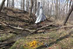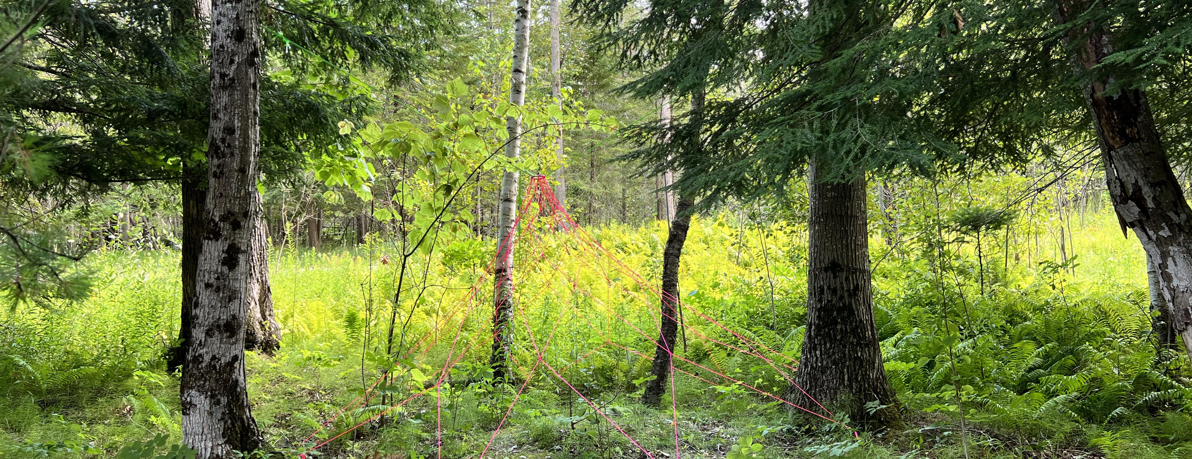 Enmeshed Study 002: Installation in northern Michigan. Hanging collaboration with three trees. Materials: Neon Pink Paracord 550