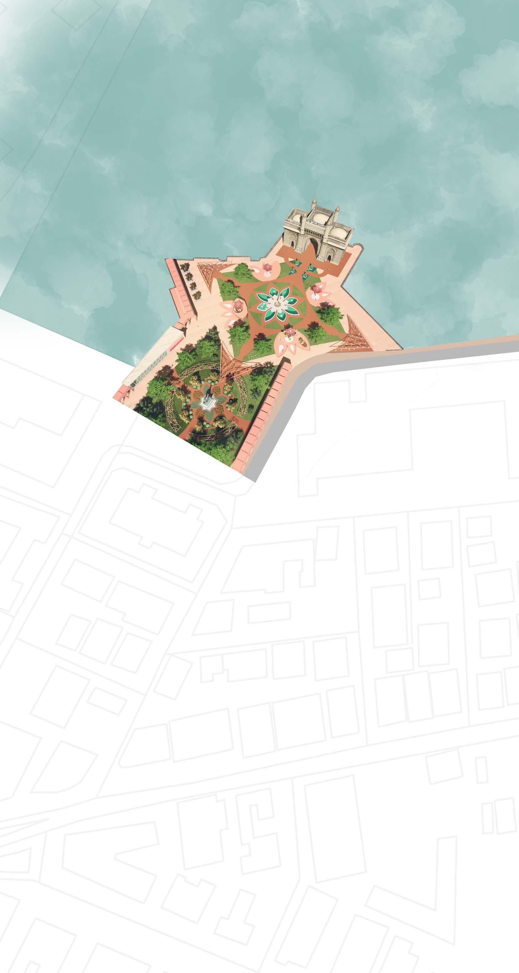 By incorporating the lotus, a sacred symbol of Lakshmi, my design uses serene reflection ponds and a lush garden to evoke a sense of tranquility and spiritual renewal. The layout of the plaza is crafted to emulate the Lotus shaped Star of Lakshmi, symbolizing the intertwinement between the physical and spiritual realms.