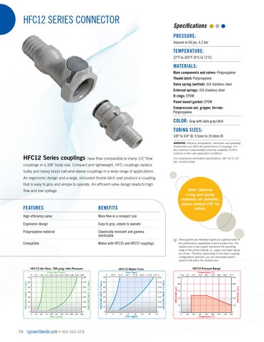 WARNING: Pressure, temperature, chemicals, and operating environment can affect the performance of couplings. It is the customer’s responsibility to test the suitability of CPC’s products in their own application conditions.