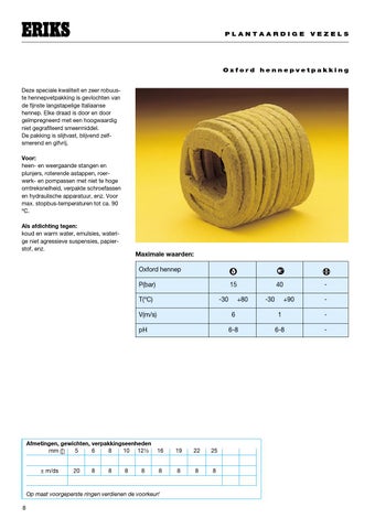 Deze speciale kwaliteit en zeer robuuste hennepvetpakking is gevlochten van de fijnste langstapelige Italiaanse hennep. Elke draad is door en door geïmpregneerd met een hoogwaardig niet gegrafiteerd smeermiddel. De pakking is slijtvast, blijvend zelfsmerend en gifvrij. Voor: heen- en weergaande stangen en plunjers, roterende astappen, roerwerk- en pompassen met niet te hoge omtreksnelheid, verpakte schroefassen en hydraulische apparatuur, enz. Voor max. stopbus-temperaturen tot ca. 90 ºC. Als afdichting tegen: koud en warm water, emulsies, waterige niet agressieve suspensies, papierstof, enz.