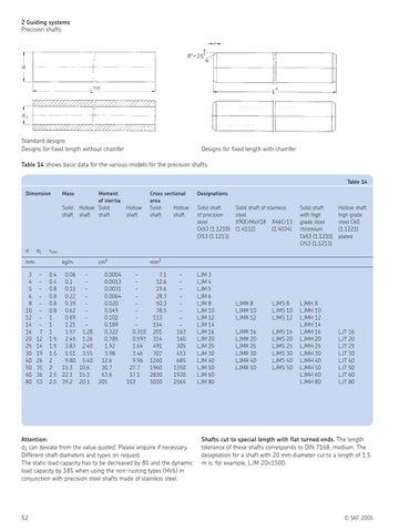 Table 14 shows basic data for the various models for the precision shafts. Table 14 Dimension