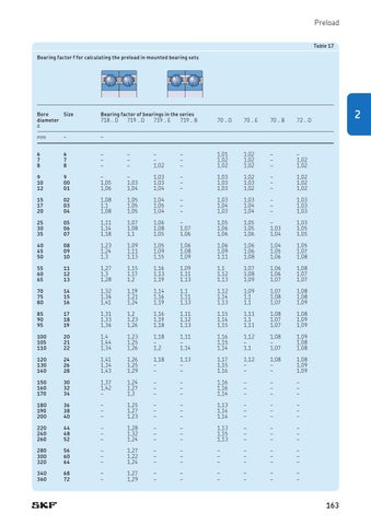 Preload Table 17 Bearing factor f for calculating the preload in mounted bearing sets