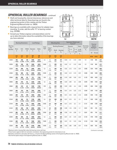 SPHERICAL ROLLER BEARINGS – continued • Shaft and housing fits, internal clearances, tolerances and other technical data for these bearings are found in the engineering section of this catalog and the Timken Engineering Manual (order no. 10424). Bearings are available with a tapered bore for adapter-type mounting. To order, add the suffix “K” to bearing number (e.g., 23120K). Consult your Timken engineer and www.timken.com for up-to-date information about the availability of the bearings you have selected.
