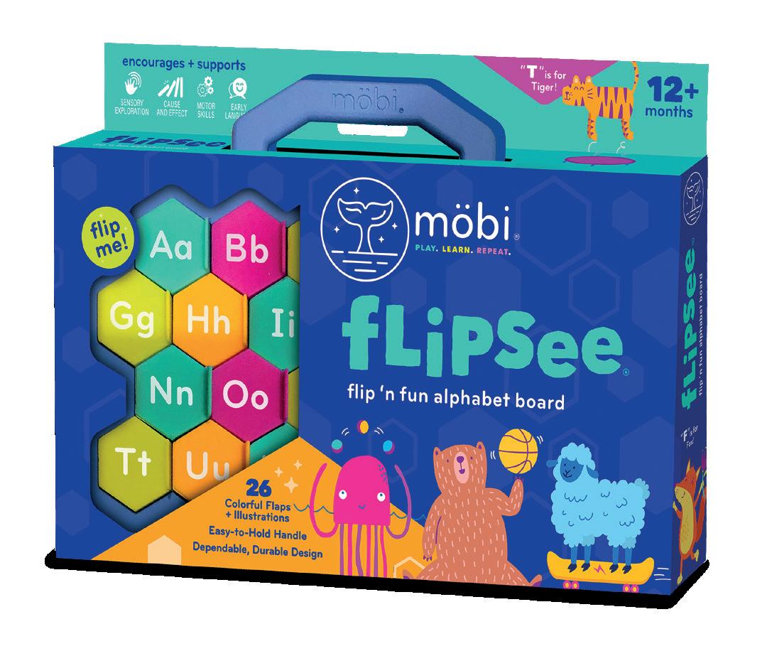 12+ months Flipsee builds and supports many different developmental skills such as: • Fine motor control • Dexterity • Mid-line play • Visual recognition • Sensory exploration • Hand-eye coordination Item #: FLIP1 UPC: 628011475046 Wholesale Price: $17.50 Suggested Retail Price: $34.99 Case Pack: 6 Units Minimum Order: 1 Case Pack • 26 Colorful flaps and illustrations • Easy-to-hold handle • Dependable, durable design A is for alligator in an airplane and Z is for zebra on a zig-zag! Discover the wonderful world of letters and animals with Flip n’ Fun Alphabet Board.