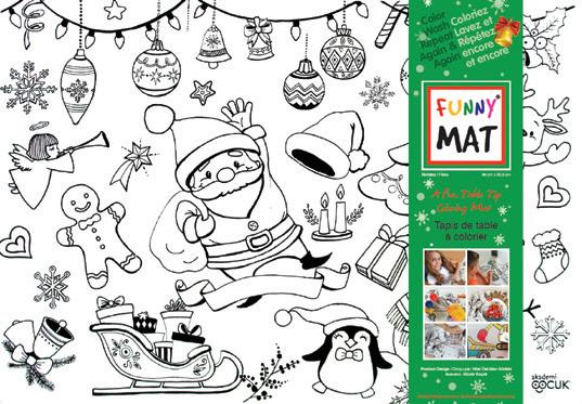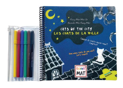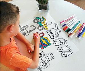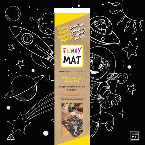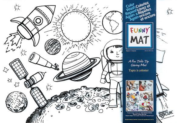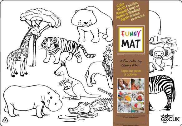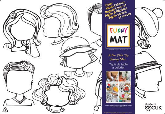Funny Mat is a table top cover that can be used for craft projects such as drawing, colouring or as a protective mat for painting, plasticine and play dough or as a placemat. The designs on Funny Mat can be coloured with water-based felt-tip markers, including Giotto, Pilot Frixion Colors or Crayola markers. Funny Mat is made from polypropylene and is recyclable and reusable.