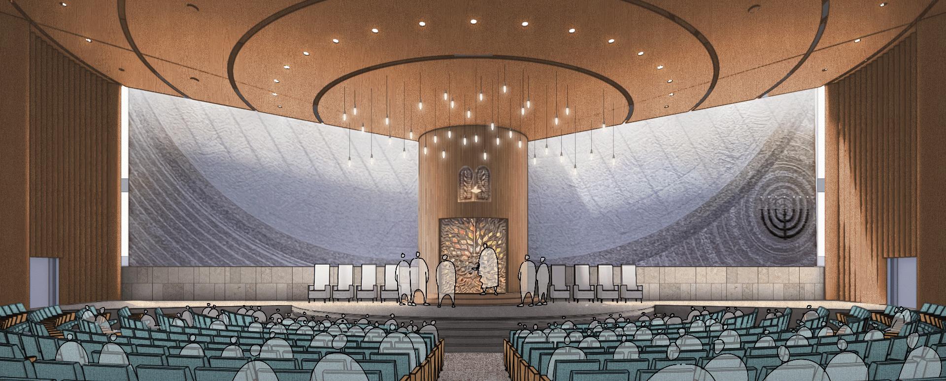 The religious institution's existing building dated back to the early 70's. Although there were some necessary maintainence and restorative work to be done, there was also an overall of interior colors and lighting. Despite many spaces being outdated, there were many beautiful aspects to the building that had been overshadowed by uncontemporary finishings - literally overshadowed. The building lacked sunlight completely in many main gathering spaces. This image is a render made to show the main sanctuary (religious gathering space) during the day and the refreshed quality some skylights and windows can make to an existing riverstone mosaic wall that wraps the back of the sanctuary.