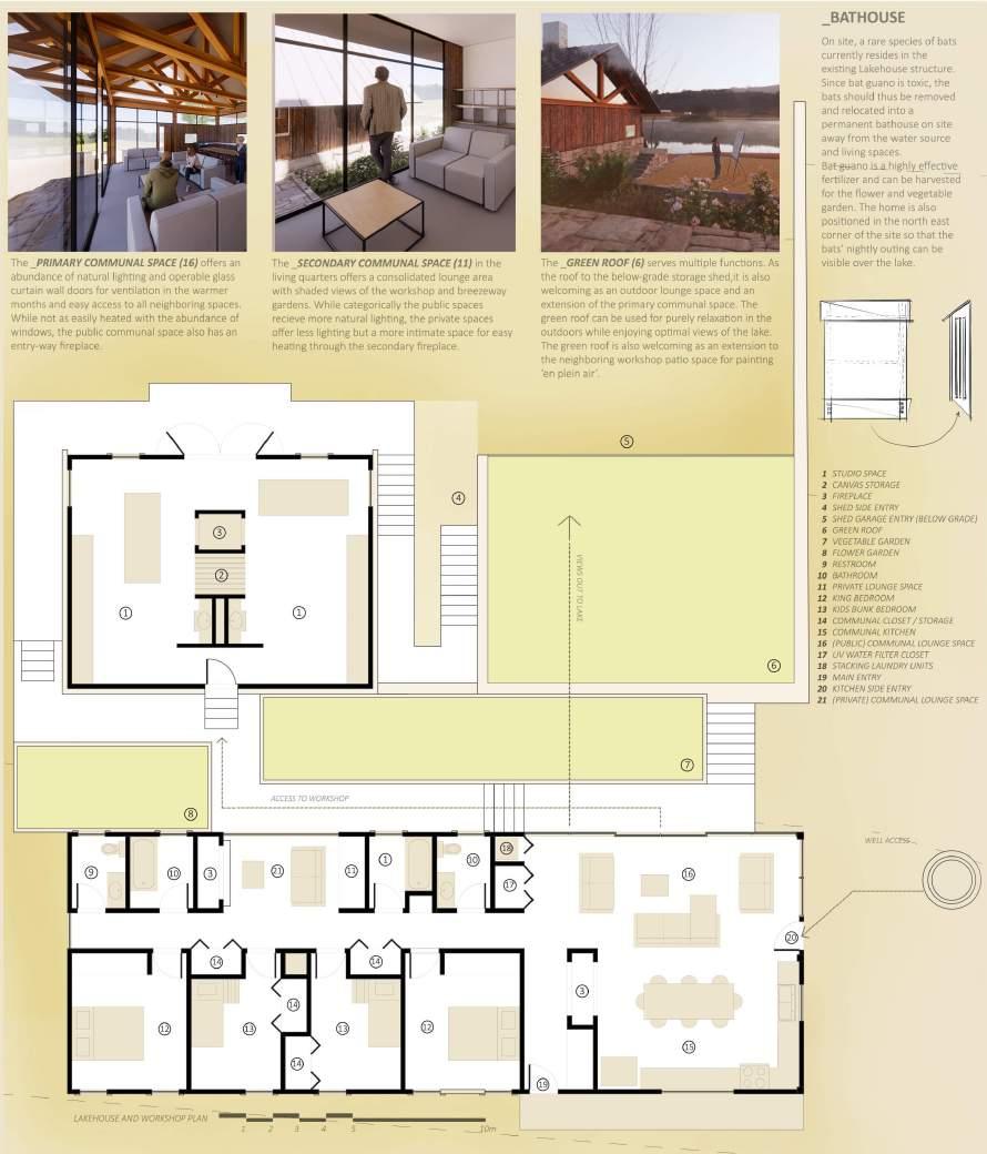The Painters’ Lakehouse and Workshop is the quintessential retreat in the form of a home and studio space for artists in temporary residence and their families. Their communal home offers picturesque and sustainable living opportunities with views of the surrounding farm country and lake. The easily accessible adjacent Workshop studio space offers ambient lighting and painting storage as well as spaces idealized for painting ‘en plein air’ on the workshop porch and the green roof of the neighboring, below-grade, storage shed.