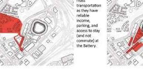 45% of Americans have no access to public transportation. The common Atlanta commuter alone will spend on average 72 hours per year in congestion. Both of these statistics include the workers, attendees, and residents of the Battery (home of Trusit Park of the Atlanta Braves baseball team). While mass transit allows for the commuter to become freed of their dependence on individual vehicles; historical, racial, economic, and social stigma as well as basic design inefficiences of mass transportation systems discredit the potent opportunity for a transit sop to become a consensus in design between economic, environmental, and social sustainability. When the stadium moved from inner Atlanta (Turner Field) to outside the perimeter of the city (2017), speculation arose as to how the demographics of the workers and attendees of the stadium (and now adjoining eat/shop/ dine attachment (The Battery)) were changed and how this correlated with access to public transportation.