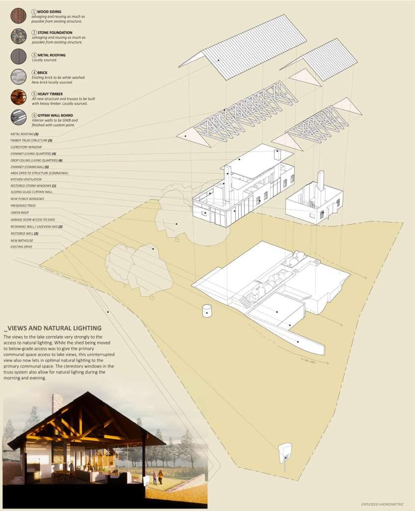 Wind as a design tool in this rural waterfront landscape focuses on the use of a ‘wind tunnel’ between the occupied spaces. The wind tunnel has access to the communal spaces while also circumventing the spaces that are to be more private and warm.