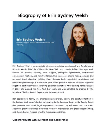 Erin Sydney Welsh is an associate attorney practicing matrimonial and family law at Brian R. Welsh, PLLC, in Williamsville, New York, just outside Buffalo. She handles matters involving divorce, custody, child support, prenuptial agreements, post-divorce enforcement matters, and family offenses. Her practice includes both trial and appellate representation, with experience in parental alienation cases. After graduating from law school in 2024, she passed the New York bar exam and was admitted to practice by the Appellate Division: Fourth Department, in January 2025. Attorney Erin Welsh, Buffalo, earned her Bachelor of Arts in Political Science and Middle East Studies from Syracuse University. She attended on a full-tuition merit scholarship through the Coronat Scholar Program and was honored as a Remembrance Scholar. She also completed the Renee Crown University Honors Program, which encourages leadership, communication, and civic engagement. She later received a Master of Philosophy in Sociology from Trinity College Dublin, graduating with first-class honors. During that time, she published a peer-reviewed article titled “Assessing Microfinance as a Means of Socioeconomic Empowerment for Vulnerable Women in Jordan.” Erin continued at the University at Buffalo School of Law, where she served on the Buffalo Law Review and earned the Robert J. Connelly Trial Technique Award. She was also a James Kent Scholar and Property Fellow. Her internships included work at the Erie County District Attorney’s Office and the Attorneys for Children Unit at the Legal Aid Bureau of Buffalo. Erin Sydney Welsh, Buffalo, volunteers as a judge for mock trials and moot court competitions and lives in Williamsville with her spouse.