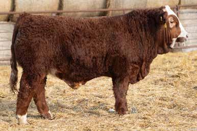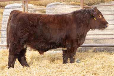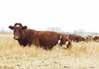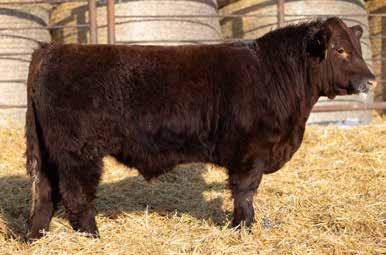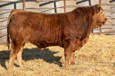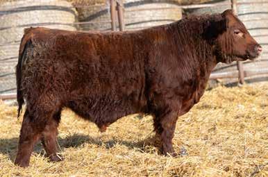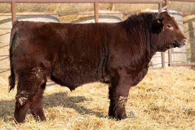 A dark red, horned bull with goggles that is super long and smoothly made from front to his powerful hindquarters. He tracks well on strong feet and legs. His dam is a standout in the pasture — moderate-framed, welluddered, with lots of milk, liver red in color with goggle eyes. Her docile nature has been passed on to him. This bull would work very well in a pen of heifers.